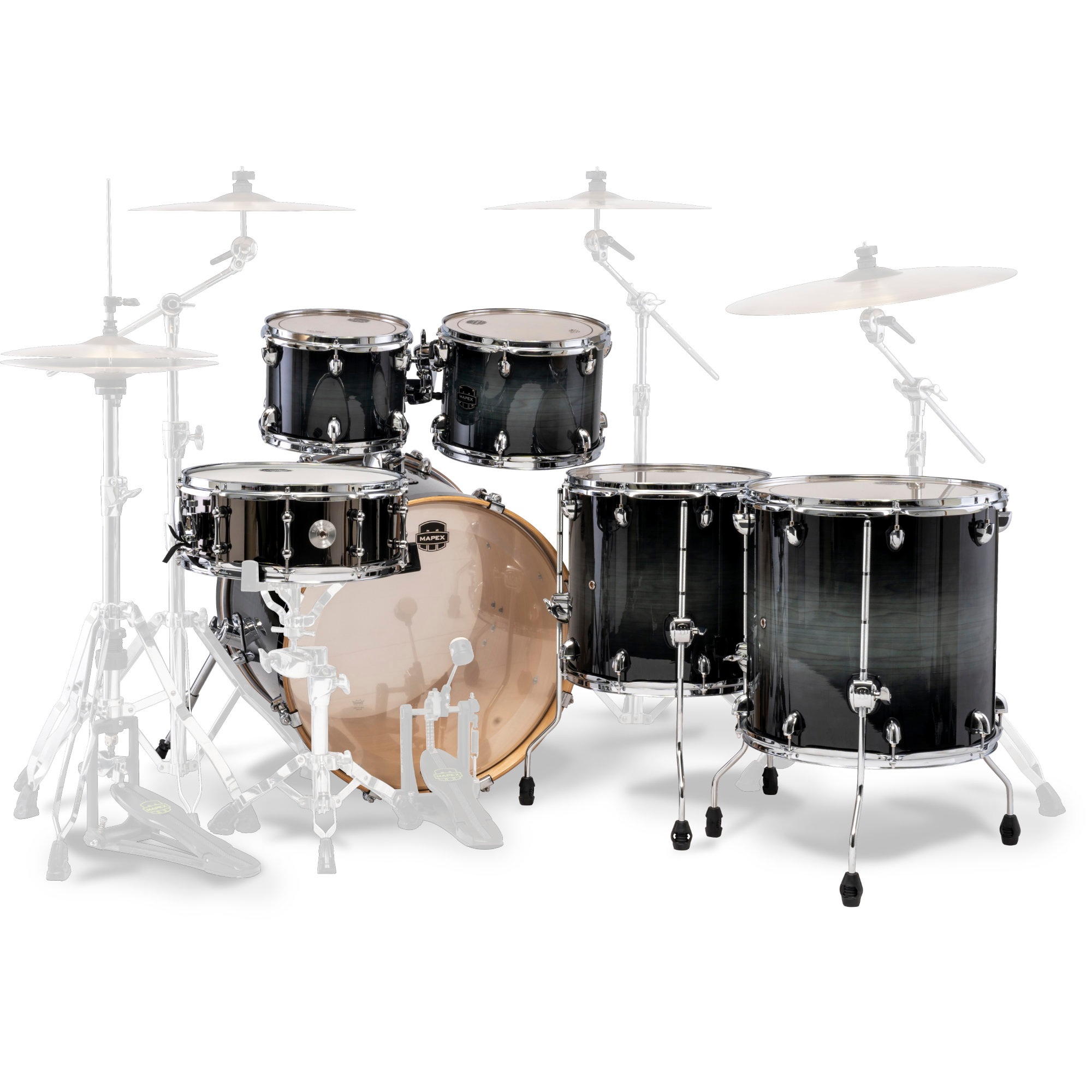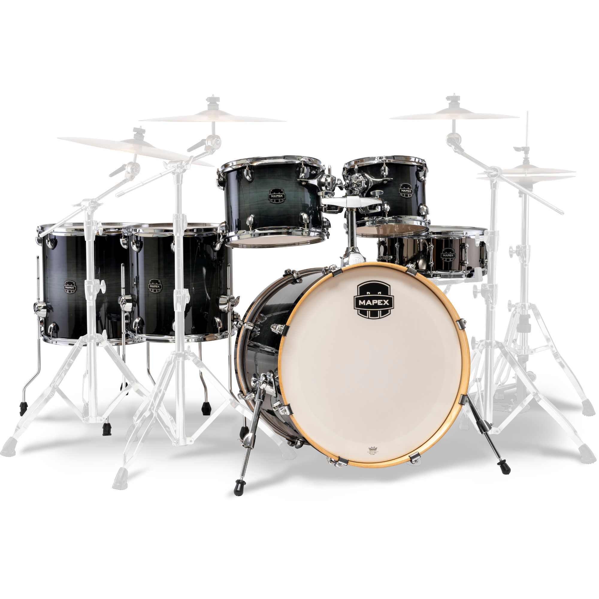 La suspension MAPEX SONIClear est complètement isolée du fût aux points de fixation, permettant aux batteries hybrides Armory en érable et bouleau de "respirer" et de révéler tout leur potentiel. Un autre atout est les pieds de grosse caisse issus de la série Saturn IV, qui préservent la pleine résonance des grosses caisses et les intègrent parfaitement au son des toms suspendus.