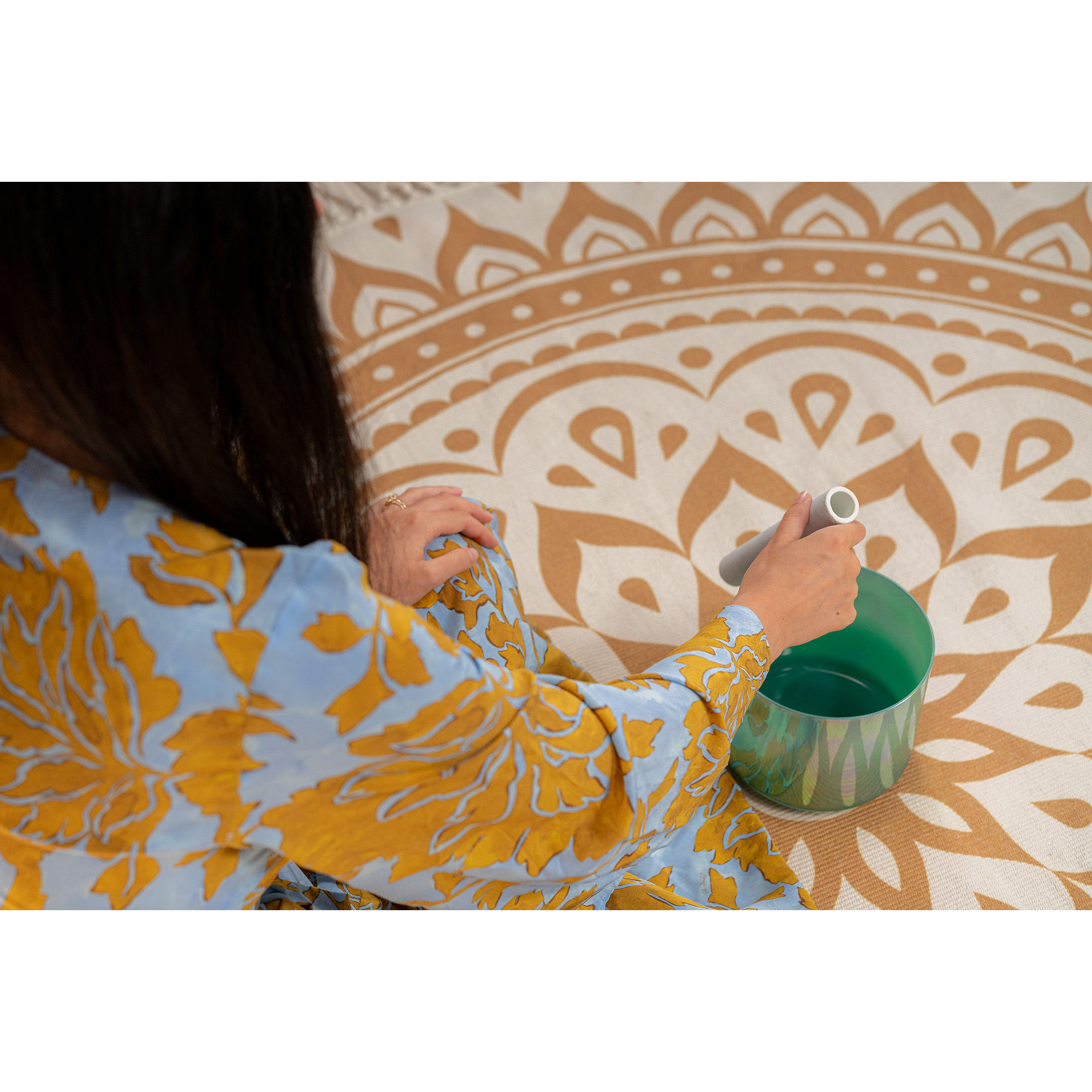 D'un point de vue esthétique, ce bol chantant Essence Solfeggio séduit également par sa finition soignée. La surface galvanisée scintille, selon l'angle de lumière, dans différentes nuances de turquoise-vert et confère à chaque pièce une profondeur visuelle particulière. Le logo et le symbole gravés soulignent son aspect exclusif et font de ce bol un objet élégant dans un cabinet, un studio ou votre intérieur.