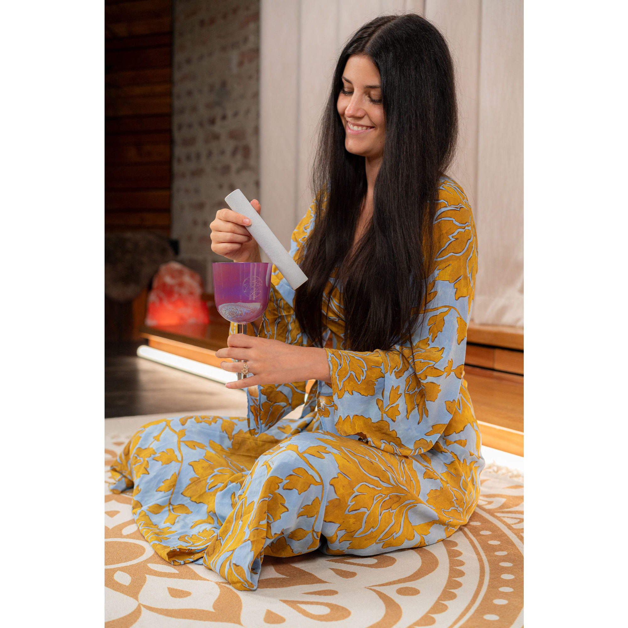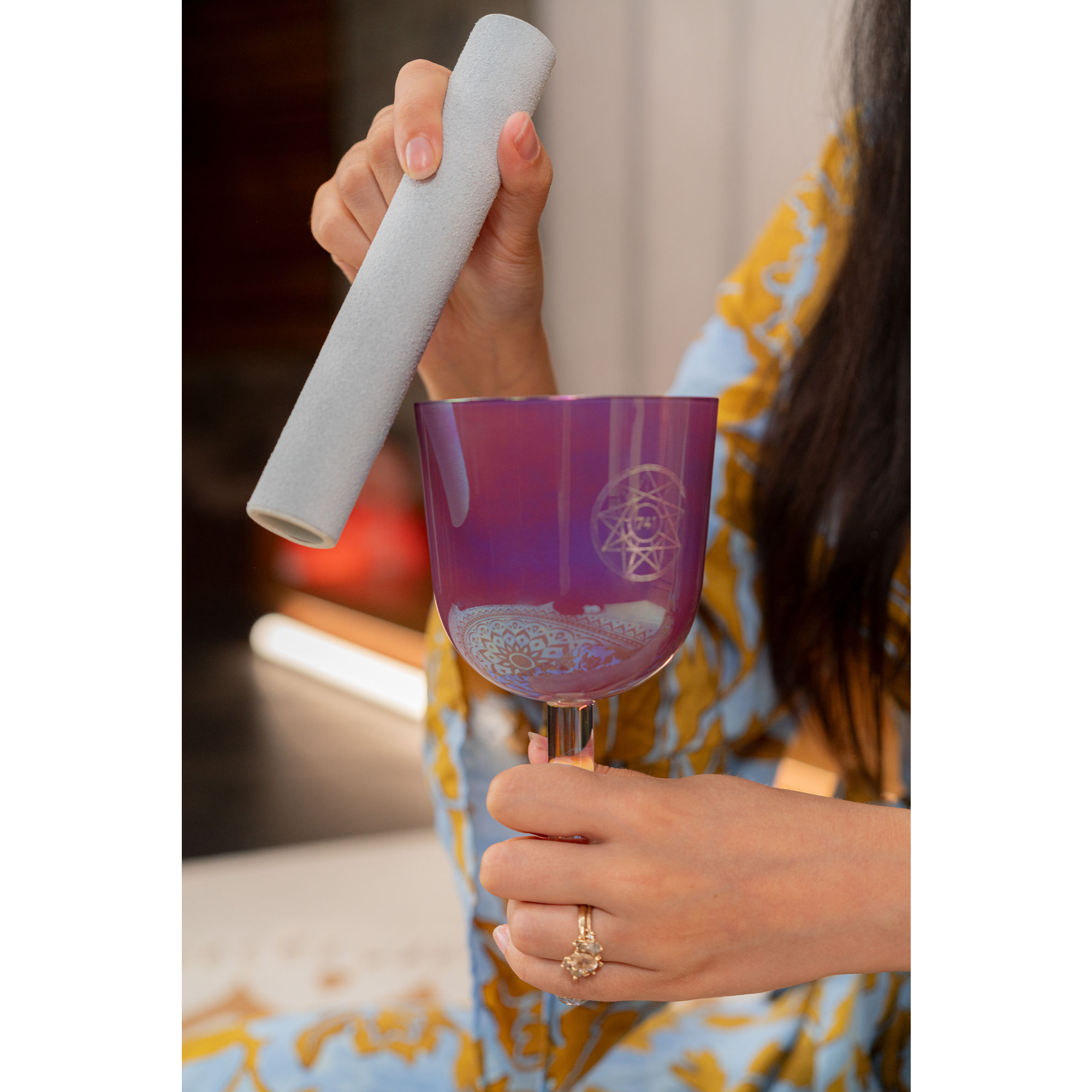 Outre sa qualité acoustique, le bol cristallin séduit aussi par son esthétique. La surface galvanisée scintille selon l'angle de la lumière dans différentes nuances de lavande violette et apporte une profondeur esthétique particulière à chaque pièce. Le logo et le symbole gravés soulignent la finition haut de gamme et font de chaque bol un objet élégant - aussi bien dans un cadre professionnel que dans ton espace de méditation personnel.