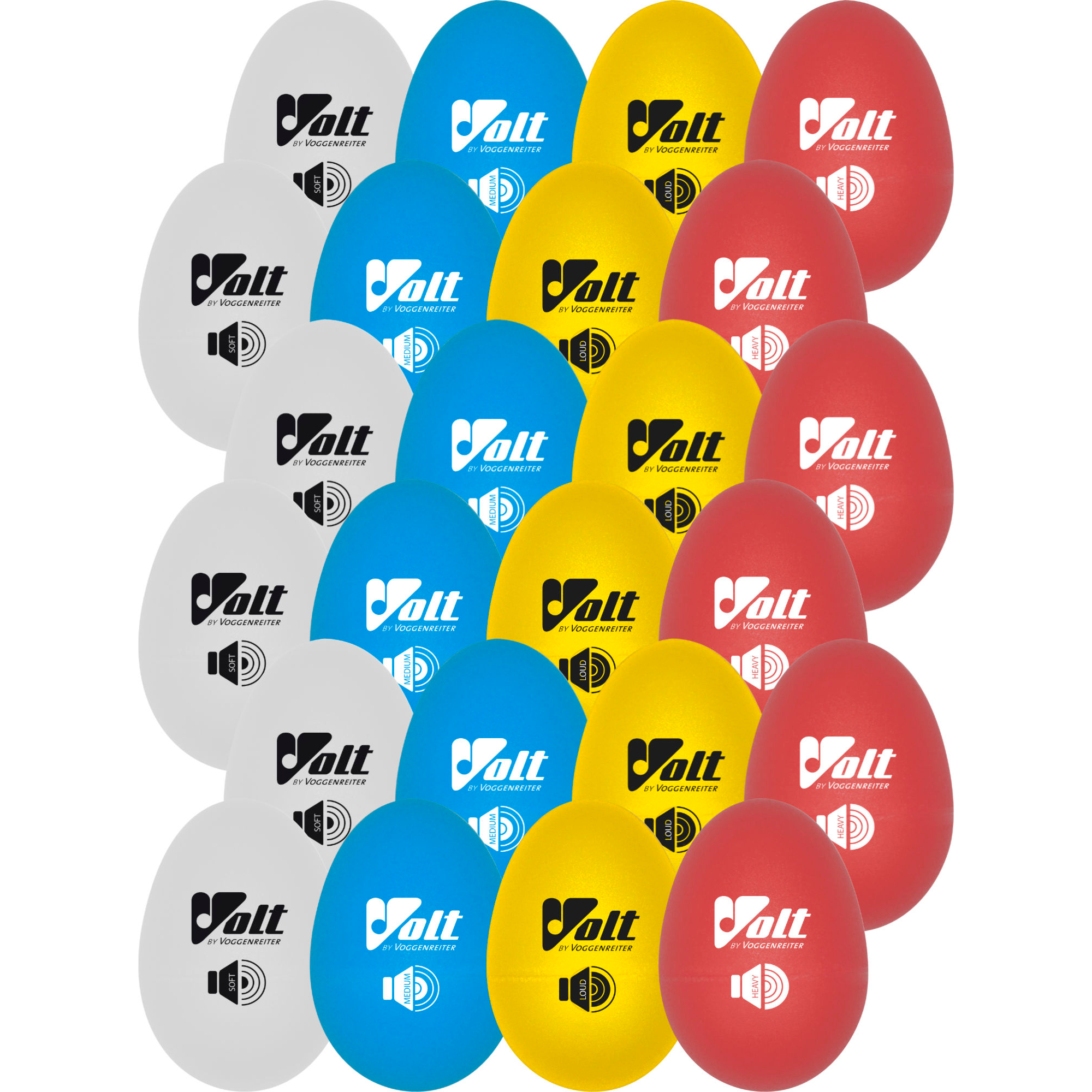 Le Set VOLT Egg Shaker est un instrument de percussion polyvalent pour l'éveil musical, la maternelle, l'école et les ensembles. Le set comprend au total 16 Egg Shakers de qualité répartis en quatre intensités sonores. Grâce au code couleur, les niveaux de dynamique se repèrent rapidement et peuvent être utilisés de façon ciblée en classe. Des accompagnements discrets aux accents rythmiques puissants, ce set couvre une large gamme d'applications musicales.