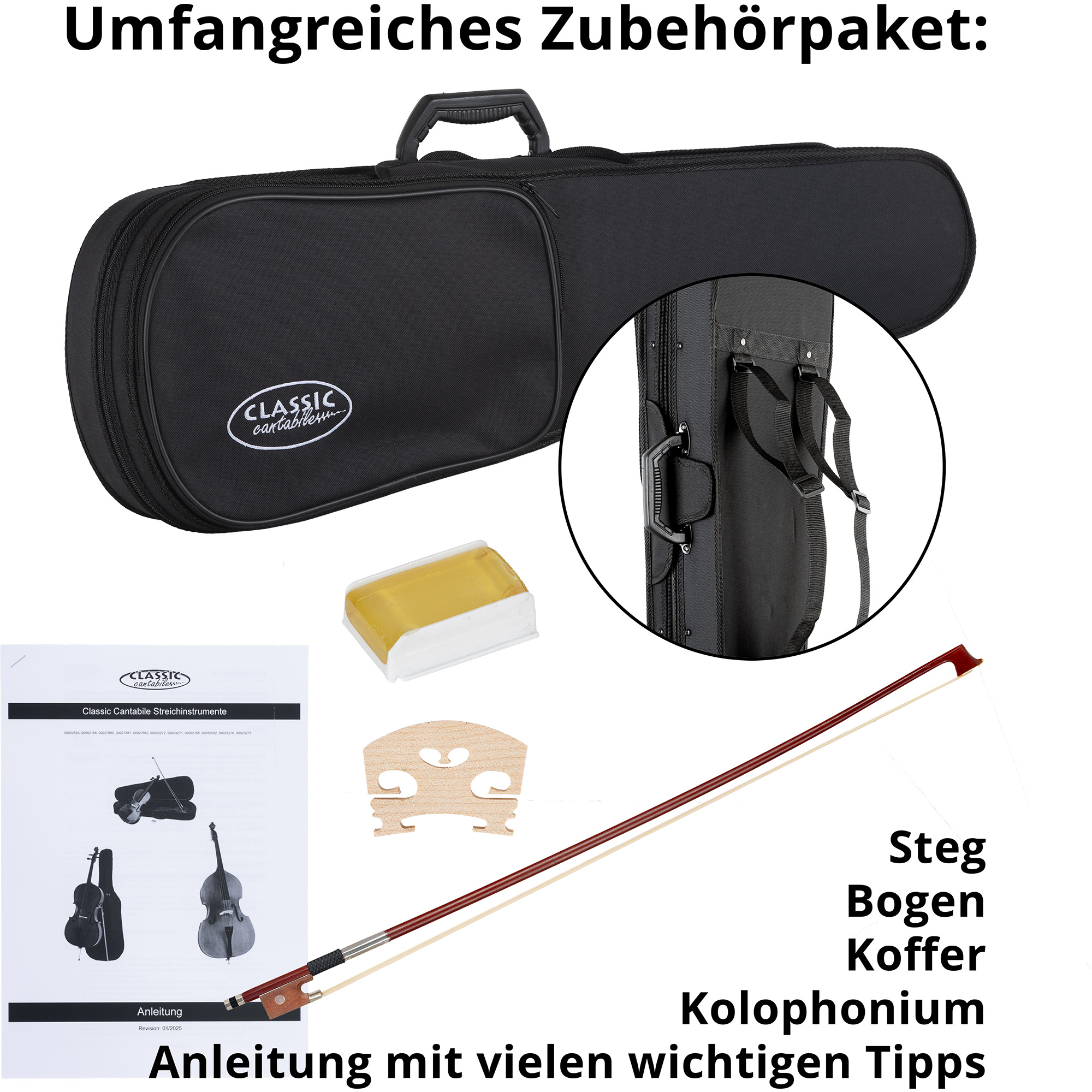 Pour que le violon vous procure du plaisir pendant des années, toutes les Classic Cantabile Étudiant ont les chevilles, la touche, le sillet et la mentonnière en bois dur. Le cordier solide avec 4 micro-accordeurs en métal renforce l’impression générale robuste du violon.