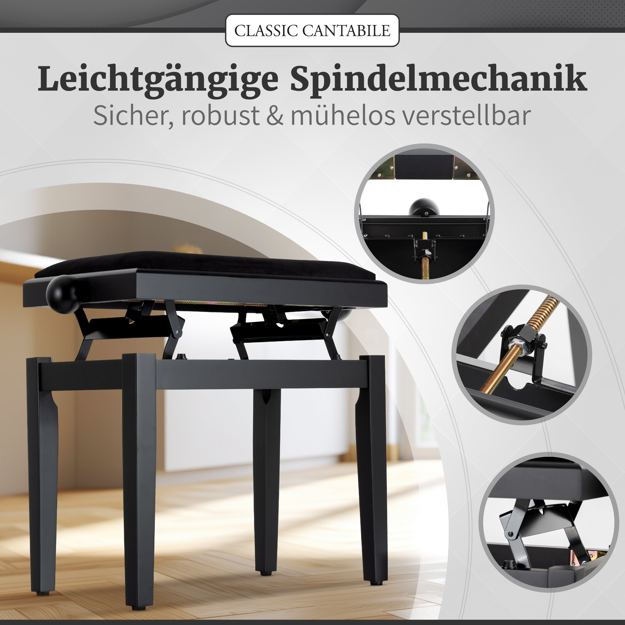Ce banc de piano allie élégance et finition de qualité : pieds stables munis de caoutchouc antidérapant, une mécanique à vis facile et précise pour le réglage en hauteur, et une assise robuste et confortable recouverte de velours côtelé. La mécanique sophistiquée à vis avec système à double ciseaux garantit un réglage de la hauteur fluide et extrêmement durable. De petits détails, comme les butées en caoutchouc entre le châssis de base et le cadre porteur, distinguent nettement ce beau banc des autres modèles de la même gamme de prix.