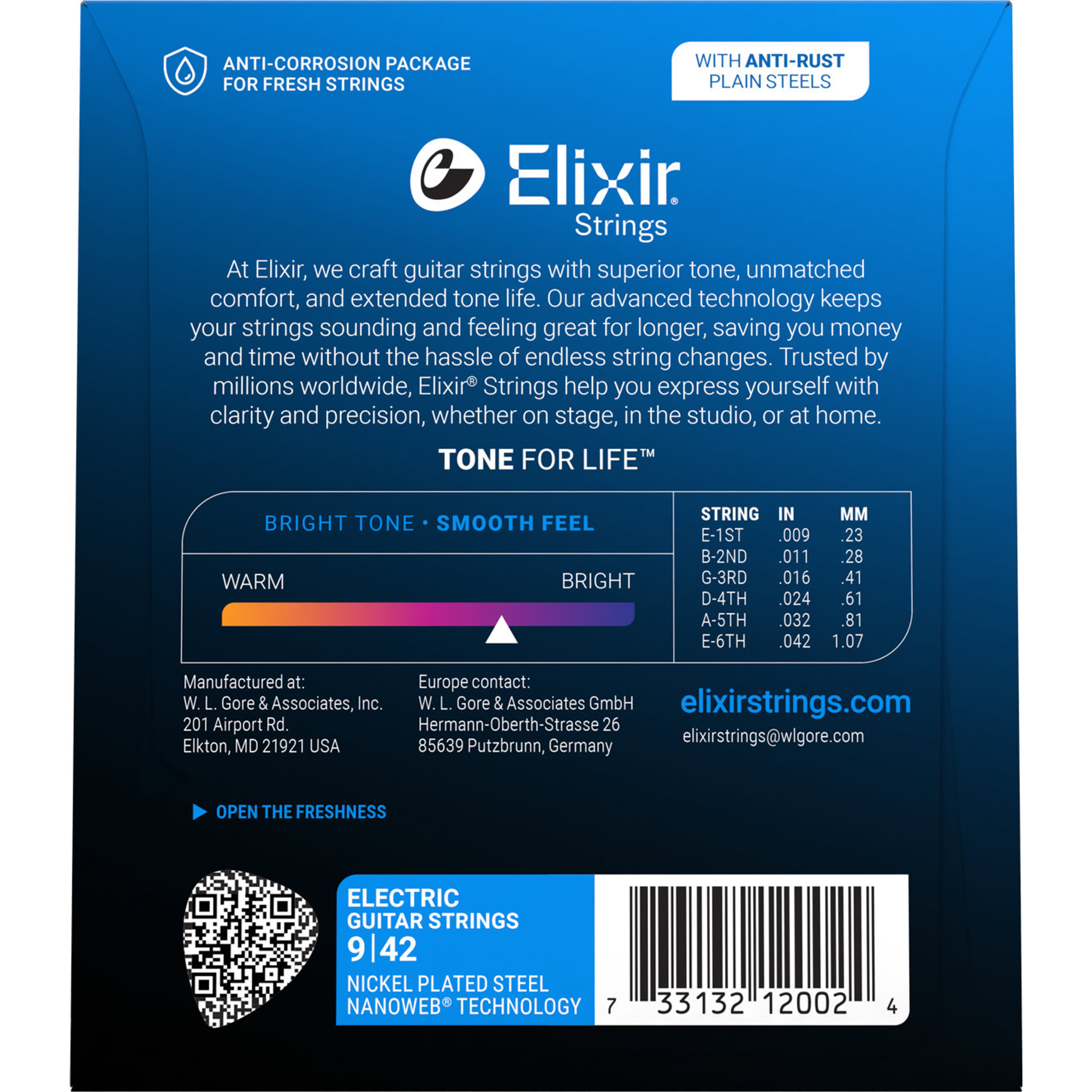 Contrairement à d'autres marques de cordes, Elixir enduit la corde dans son intégralité. Ainsi, non seulement la surface de la corde est protégée, mais aussi les espaces entre les spires du bobinage, où s'accumule habituellement la saleté qui tue le son sur les cordes d'autres marques. Et le revêtement anti-rouille des cordes en acier nu garantit à l'ensemble du jeu une tenue de son plus durable.