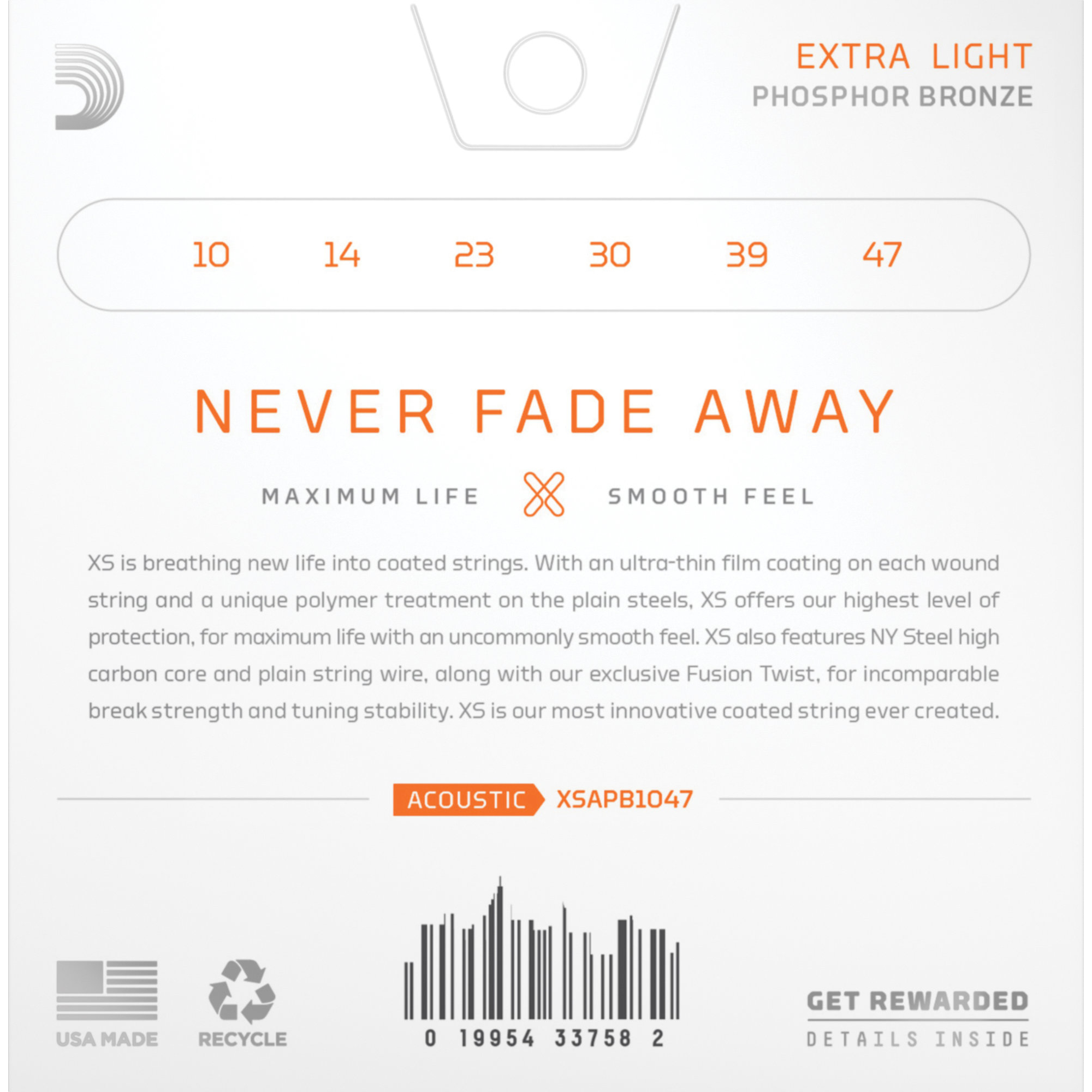 Les cordes XS Acoustic Phosphor Bronze combinent l'alliage de cordes le plus apprécié de D'Addario avec la technologie de revêtement la plus avancée. Le résultat: un son clair, une sensation de jeu souple et une stabilité d'accord remarquable — le tout avec une longévité optimisée. Grâce à un film ultrafin sur chaque corde filée et à un traitement polymère exclusif du fil d'acier nu, les XS offrent une protection maximale pour une durée de vie prolongée. De plus, les XS sont dotées d'un noyau NY Steel à haute teneur en carbone et d'un fil lisse, ainsi que de l'exclusive Fusion Twist de D'Addario, qui garantit une résistance à la rupture et une stabilité d'accord incomparables.