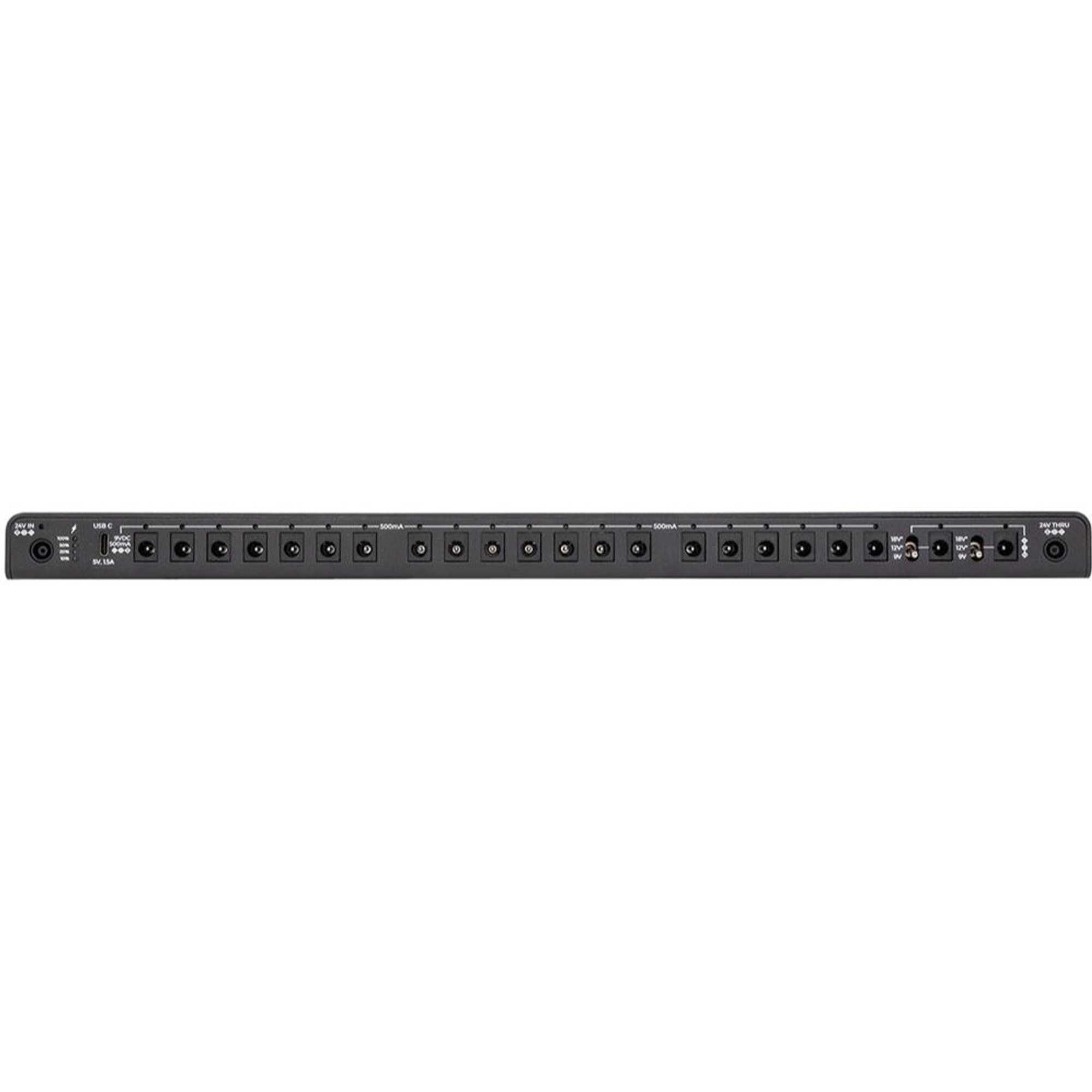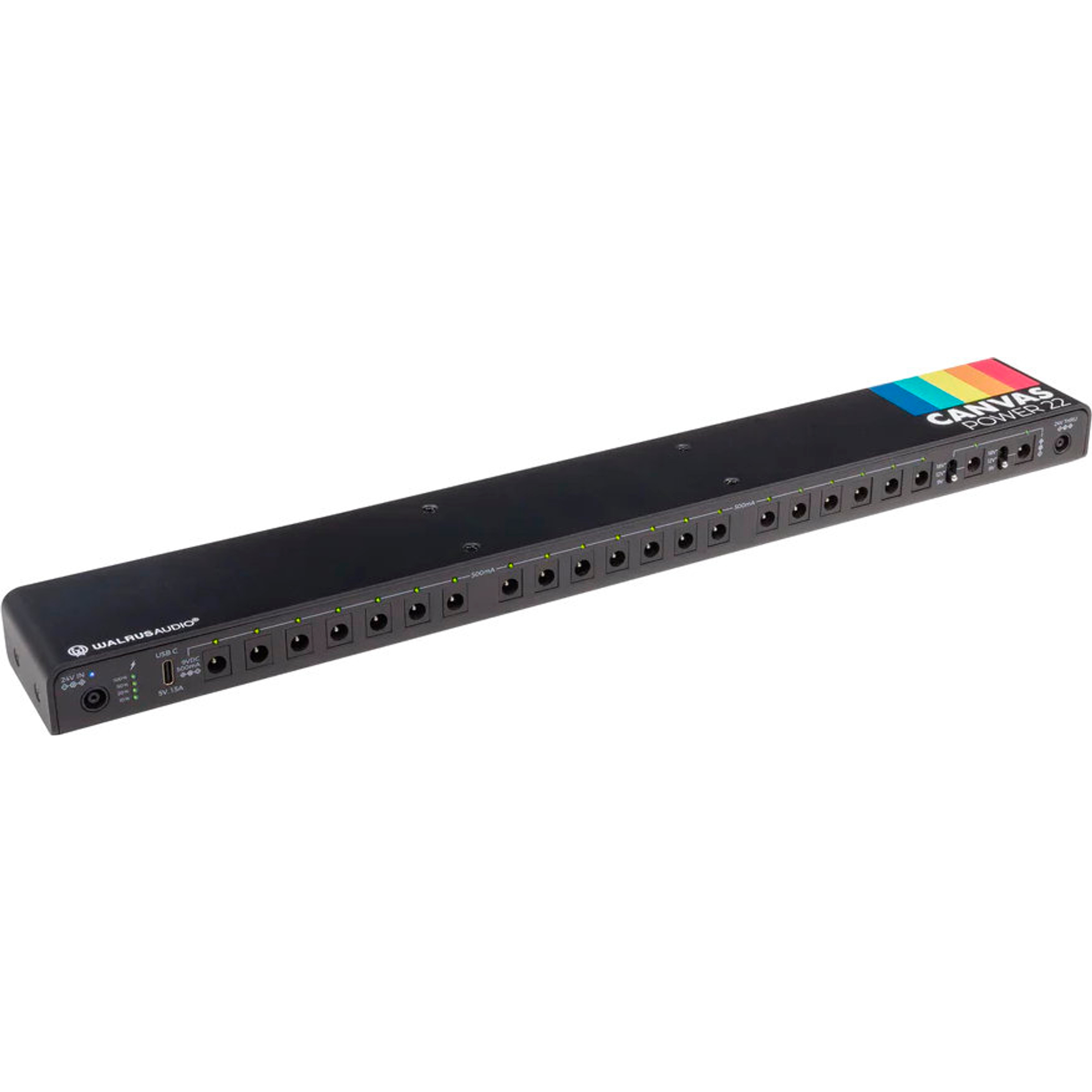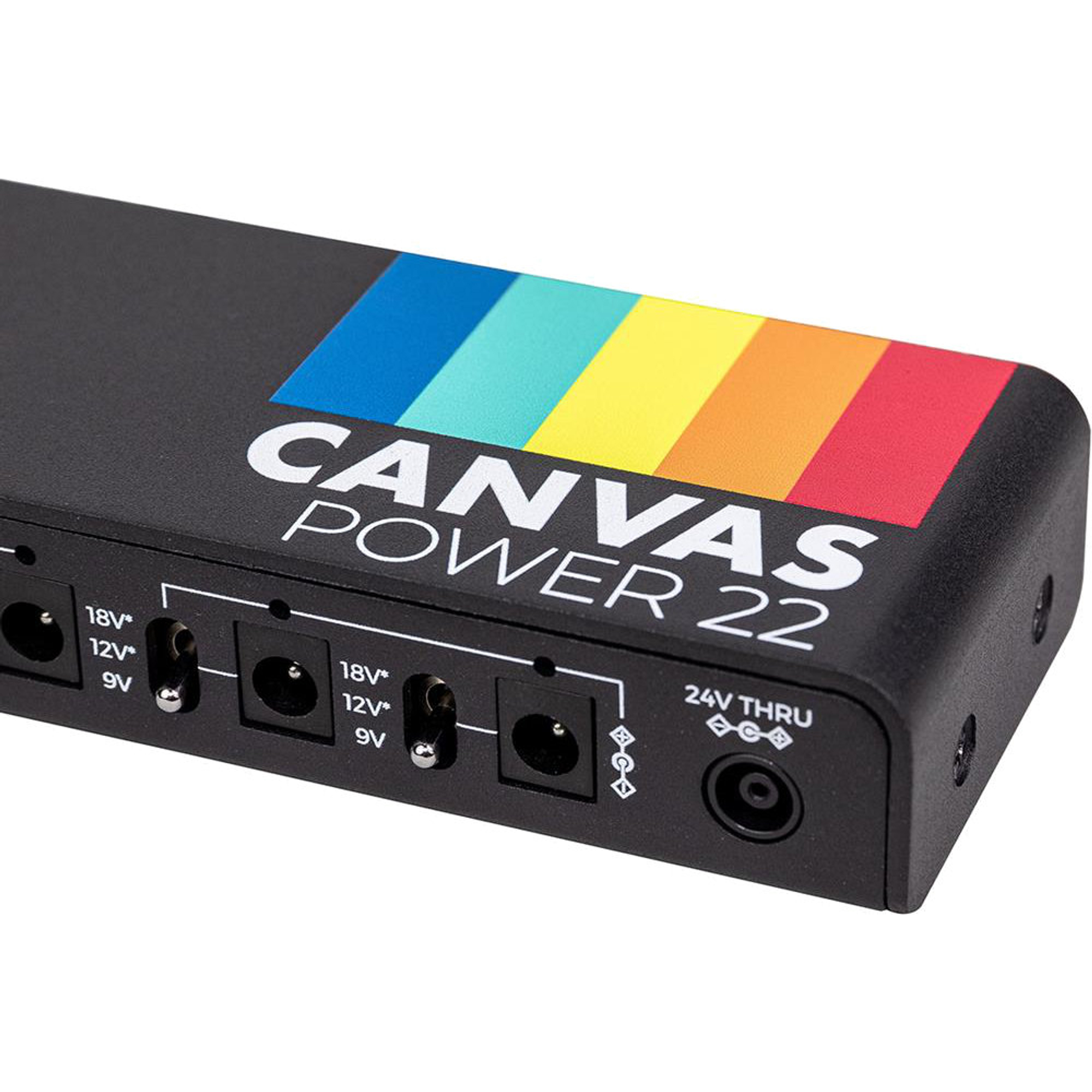 Le Canvas Power 22 offre 22 sorties d'alimentation isolées fournissant jusqu'à 500 mA de courant « propre » en 9 V. Deux sorties ont une tension variable, te permettant de commuter entre 9 V, 12 V et 18 V pour alimenter des pédales haute tension. Il dispose aussi d'un port USB-C pour alimenter des appareils comme ton téléphone ou ta tablette pendant que tu joues.