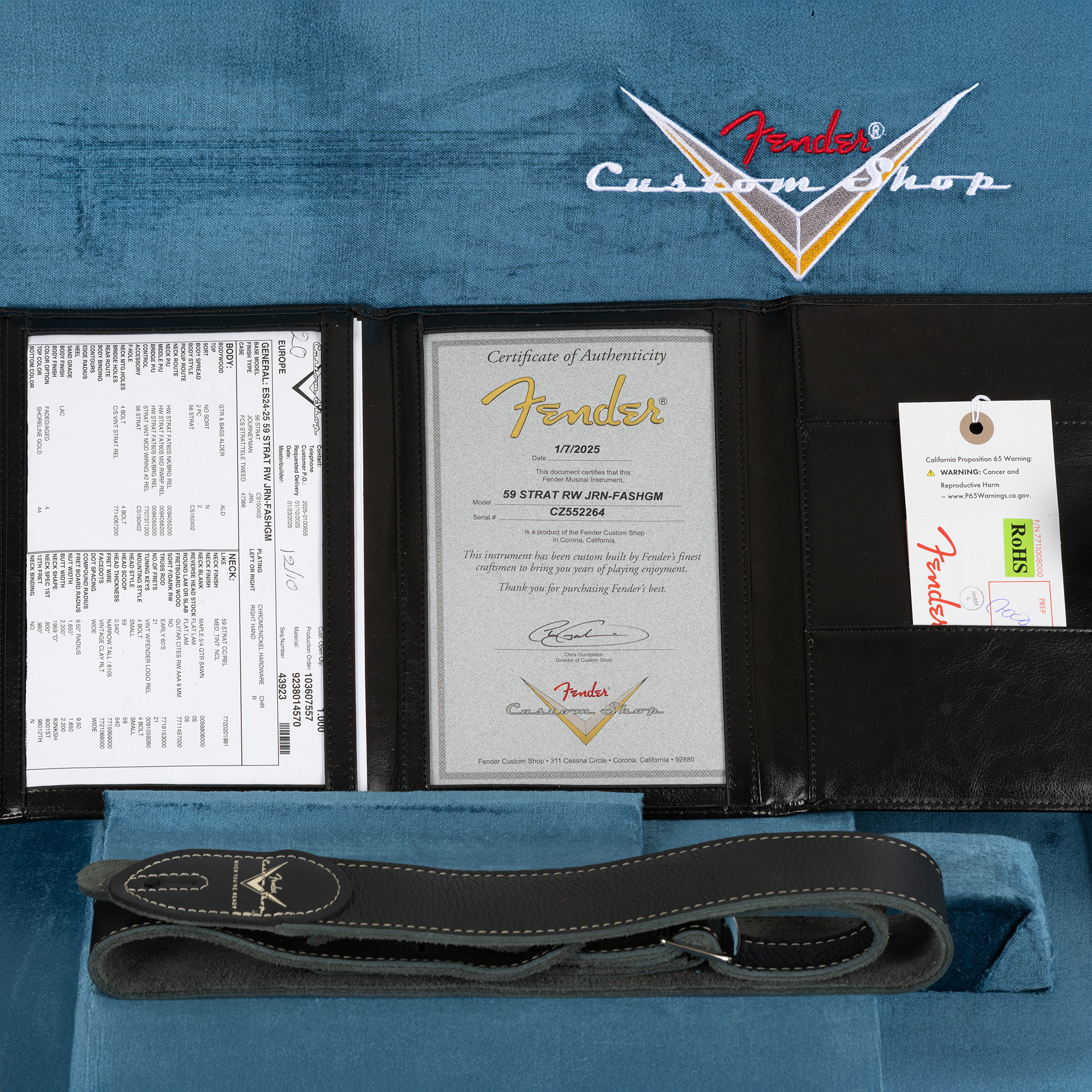 Parmi les autres caractéristiques premium figurent un radius de touche de 9,5", 21 frettes Narrow Tall, un sélecteur 5 positions, un vibrato Vintage du Custom Shop, des mécaniques de style vintage, un sillet en os, une barrette de retenue des cordes, un étui rigide deluxe, une sangle et un certificat d'authenticité.