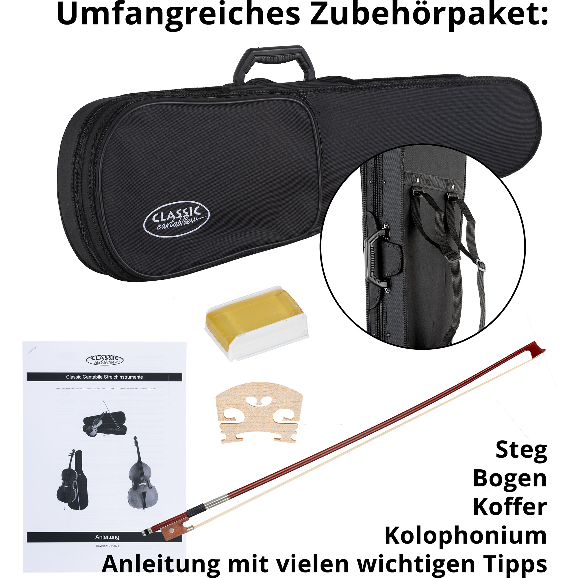 Le set de violons Classic Cantabile de la série Student s’adresse principalement aux débutants et violonistes avancés cherchant à acquérir une qualité à prix abordable. Le son harmonieux du violon fait main est unique dans cette gamme de prix ! La table est en épicéa massif, tandis que le fond et les éclisses en érable soulignent le design classique de cet instrument noble.