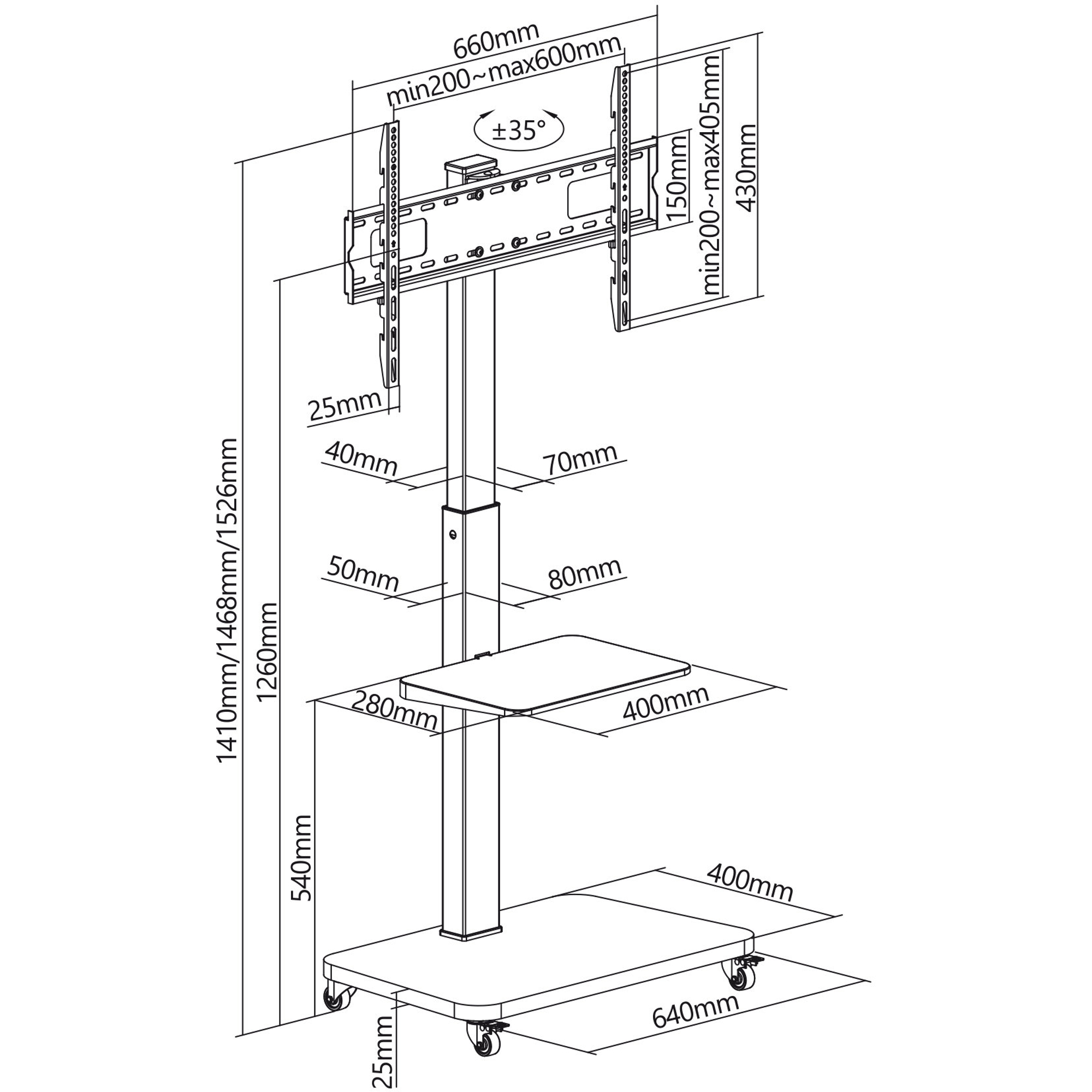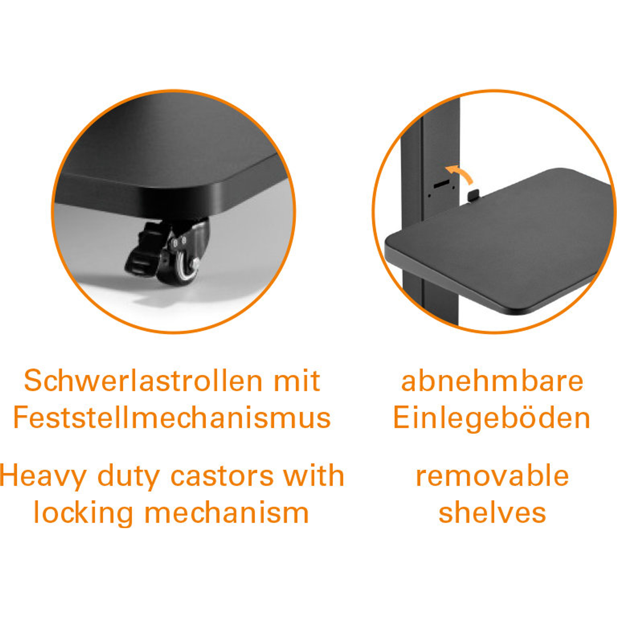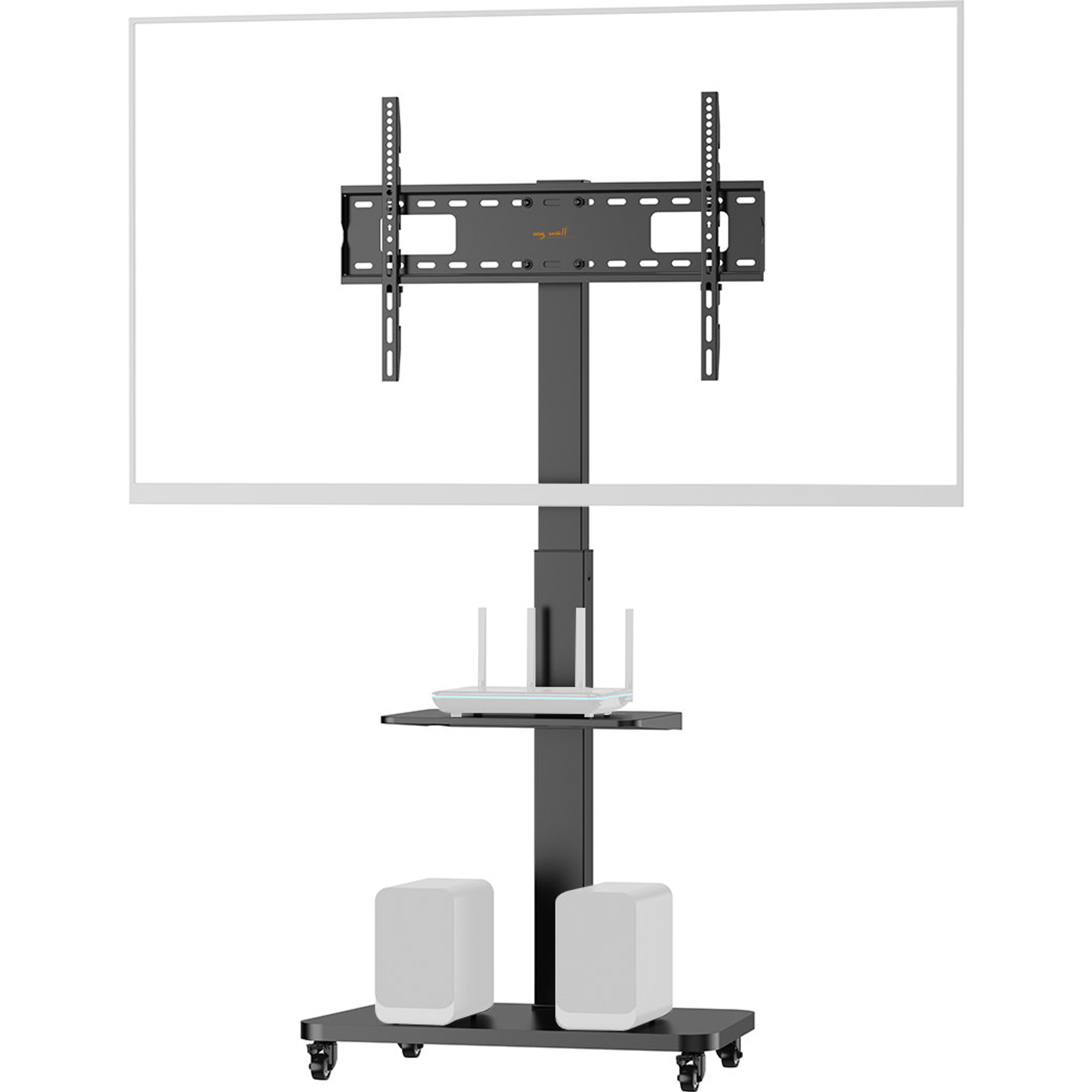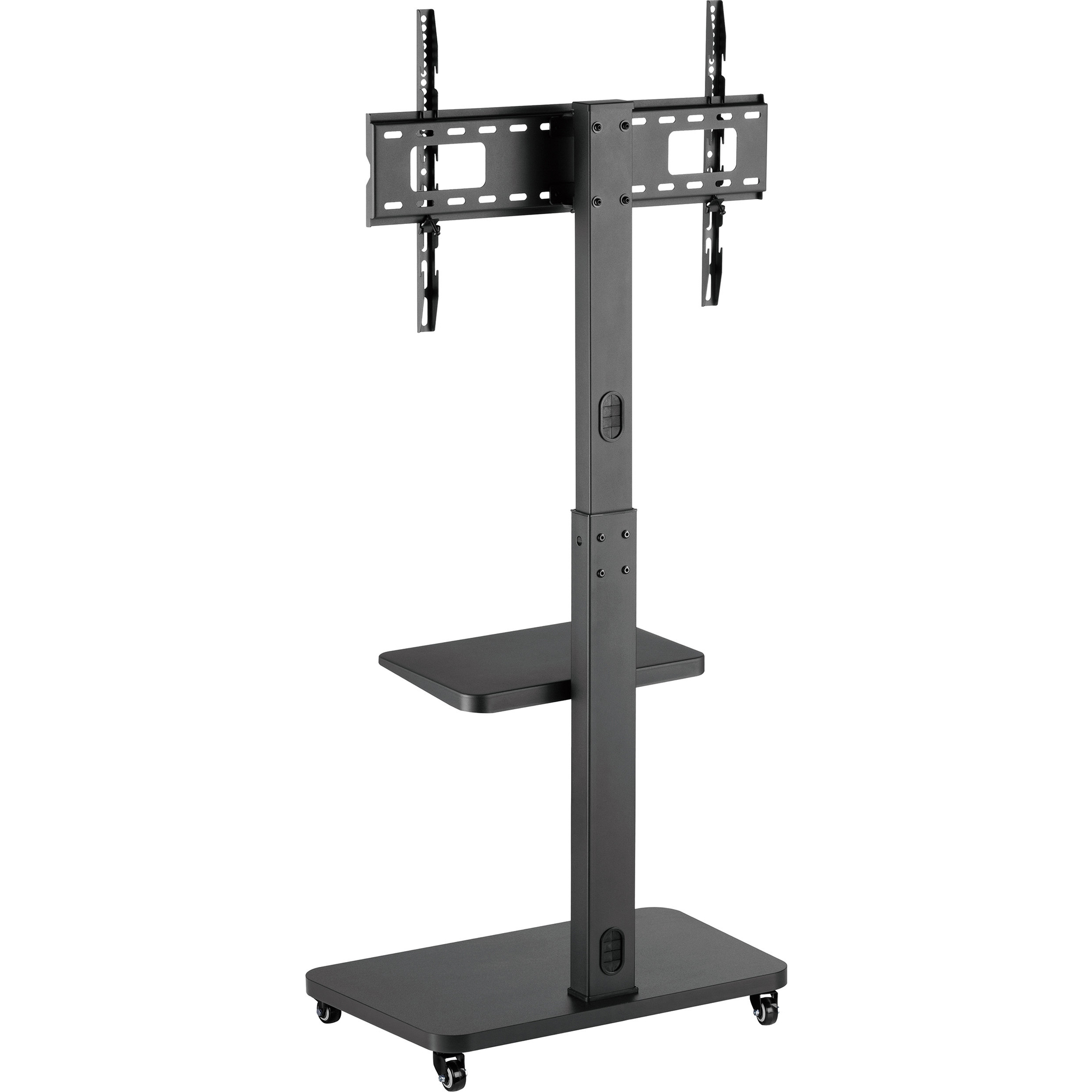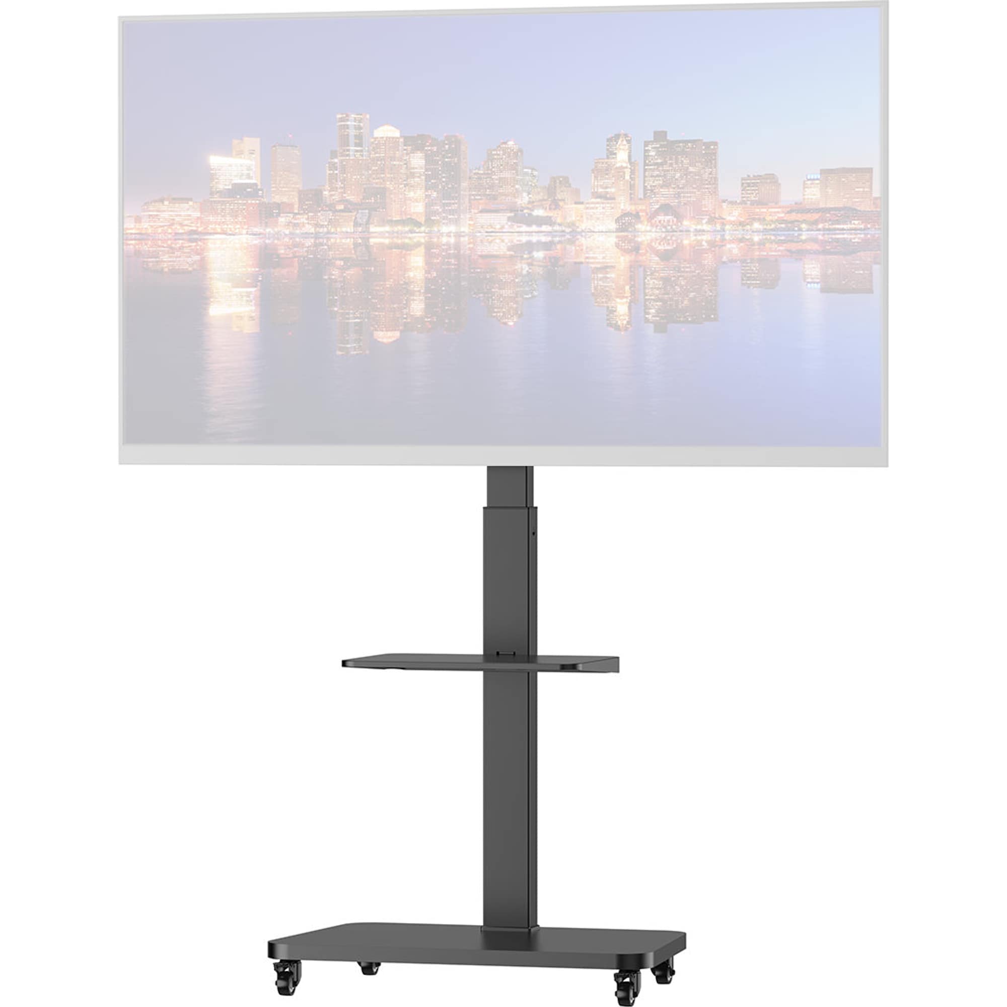 Grâce aux roulettes intégrées avec mécanisme de blocage, le support se déplace facilement et s'installe rapidement où vous le souhaitez. Salon, bureau ou salle de réunion - votre écran devient mobile et polyvalent. Les roulettes se verrouillent pour garantir que le support reste stable et sûr une fois positionné.