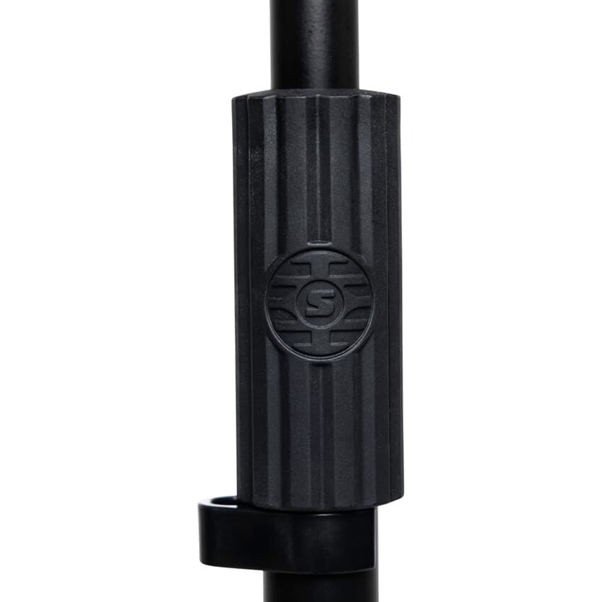 Il est fabriqué en acier noir avec revêtement poudre et offre une grande durabilité, que ce soit sur scène ou en studio. Le socle de 12" assure plus de stabilité que la version 10", tout en étant équipé du même caoutchouc anti-vibrations pour minimiser les bruits indésirables et les bruits de pas.