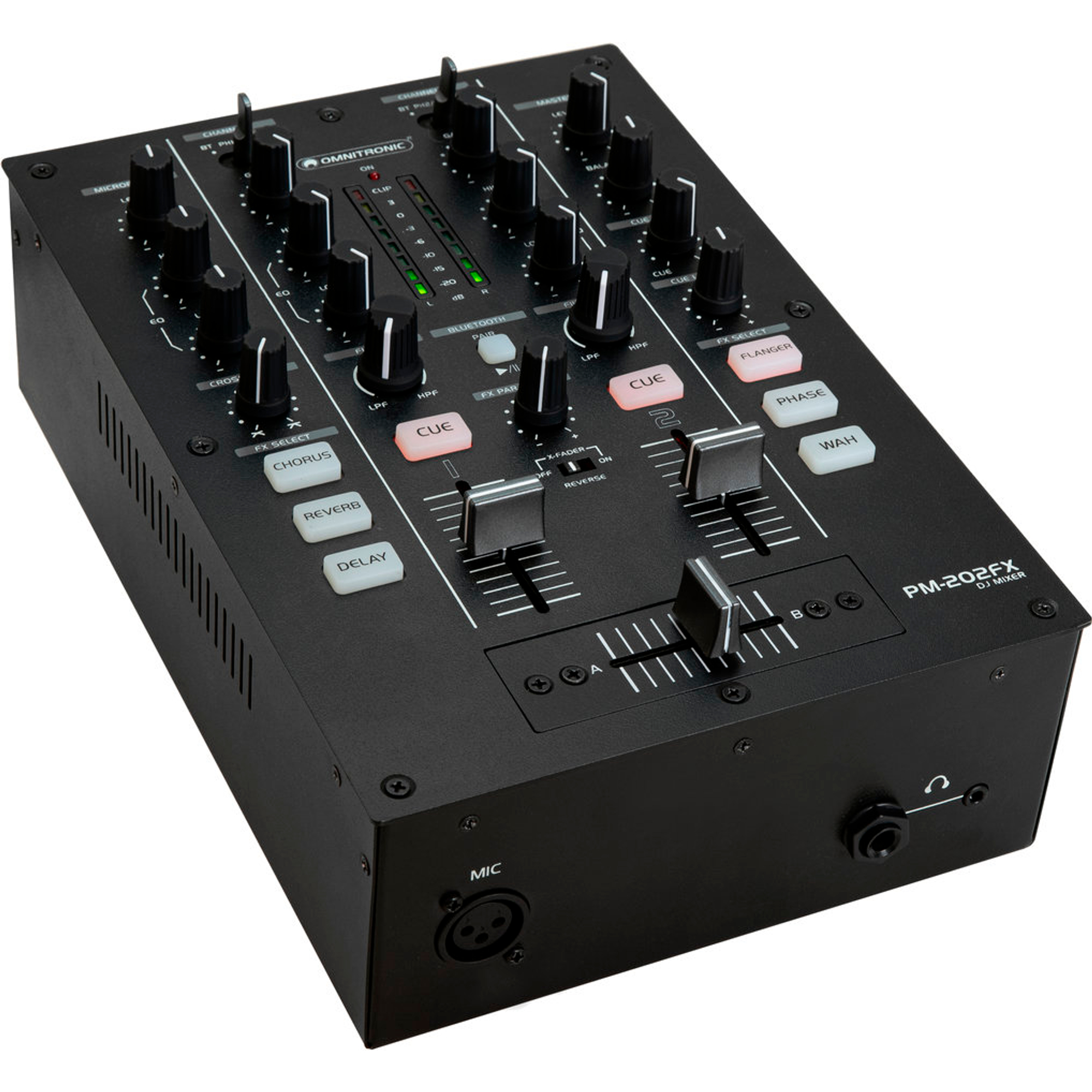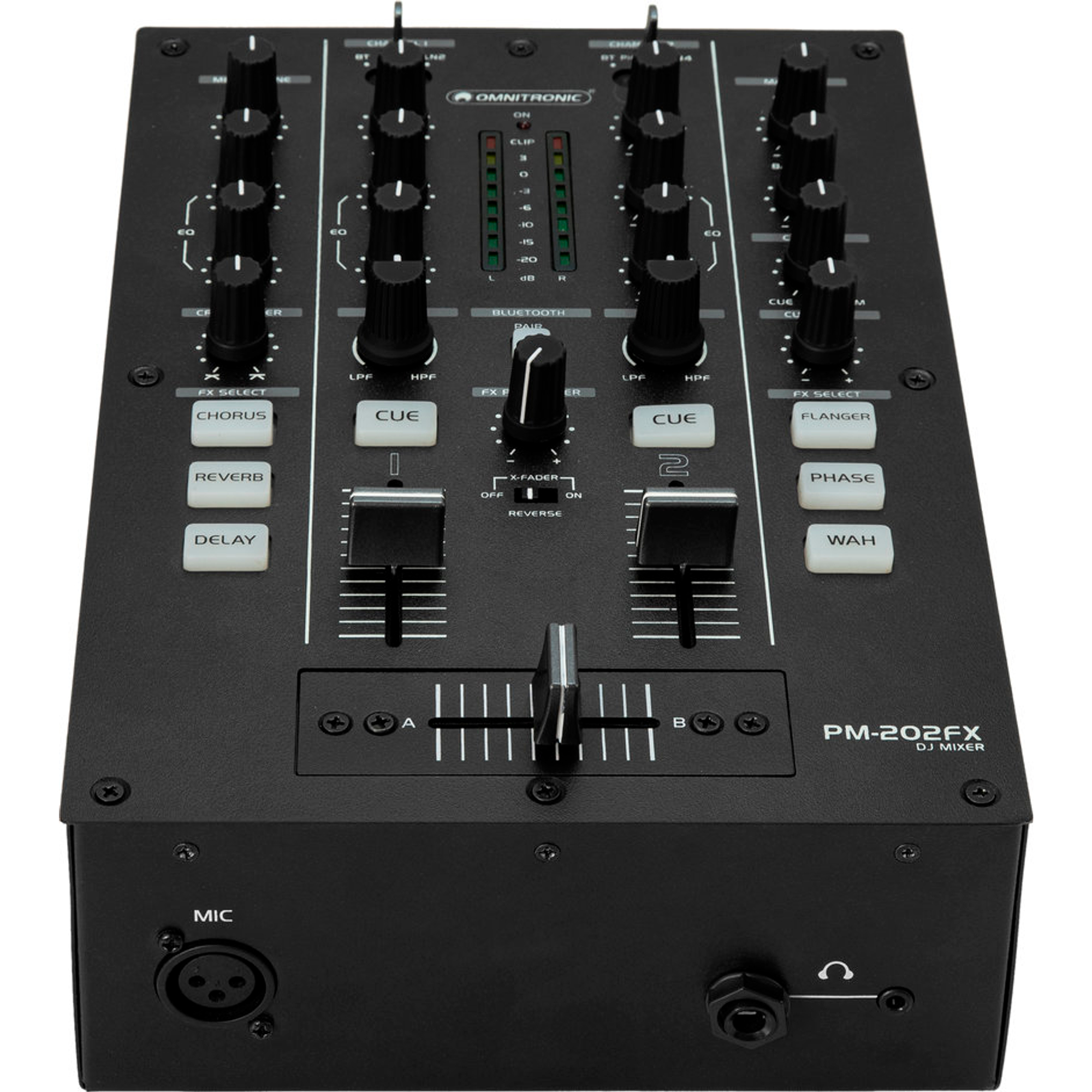 Le PM-202FX offre deux entrées ligne et deux entrées phono via prises RCA ainsi qu’une entrée micro avec réglage de volume et égaliseur 2 bandes. Le crossfader possède une courbe réglable et un bouton inverseur, idéal pour les DJs scratch. Tous les canaux d’entrée et le master peuvent être pré-écoutés via la sortie casque stéréo réglable.