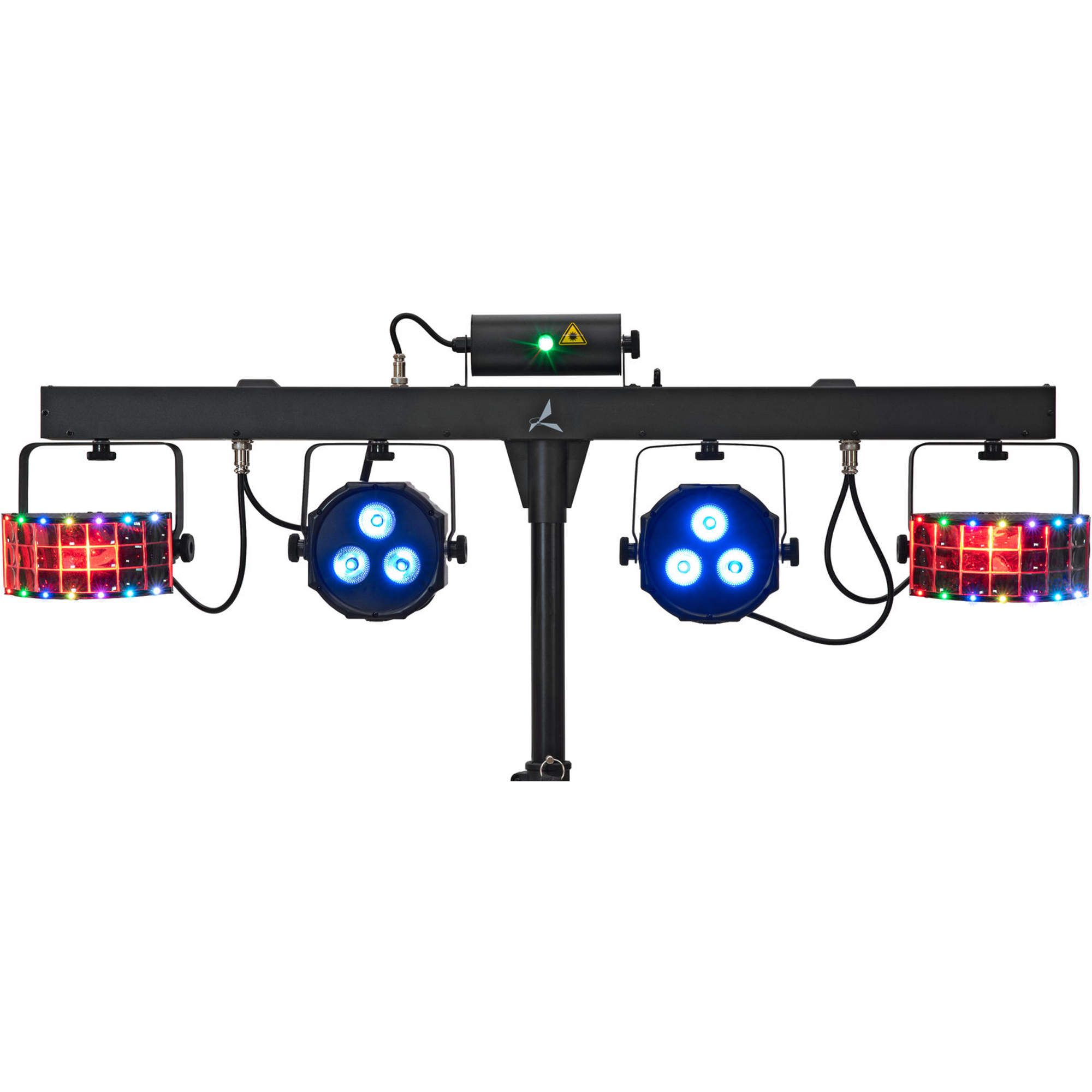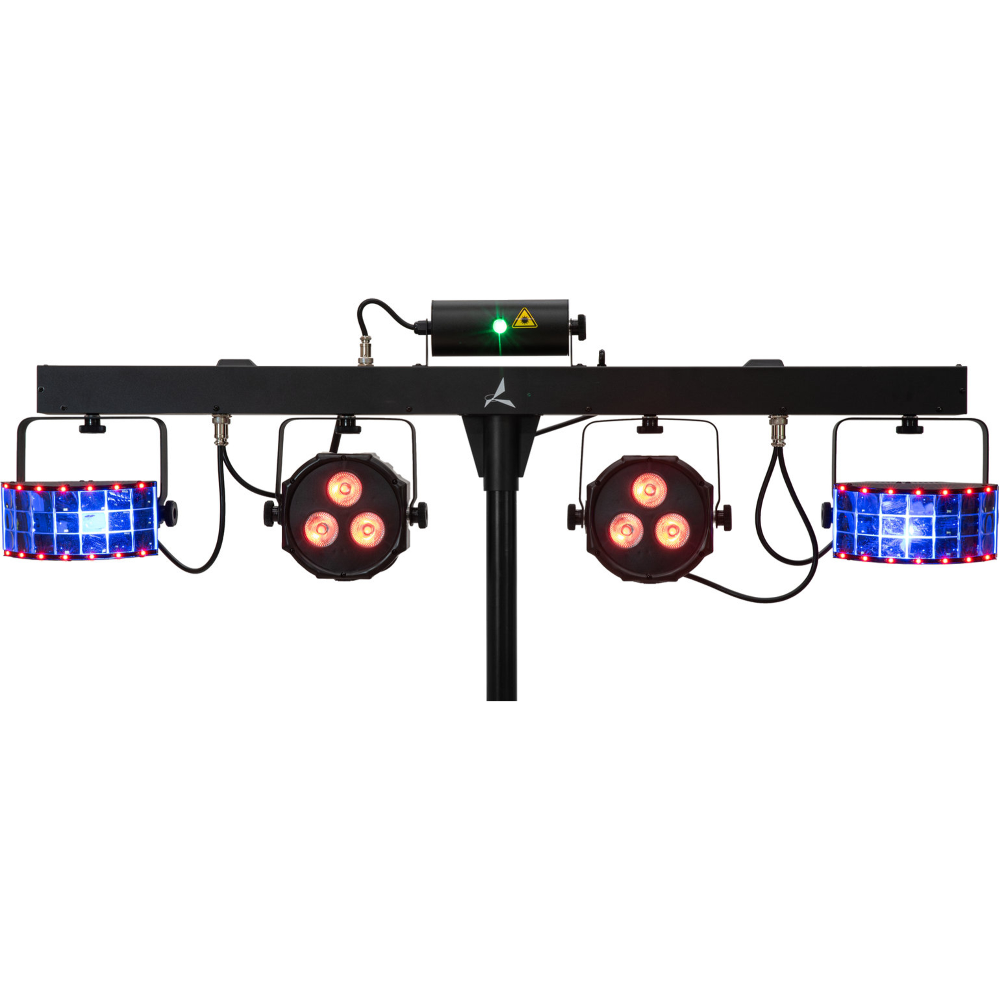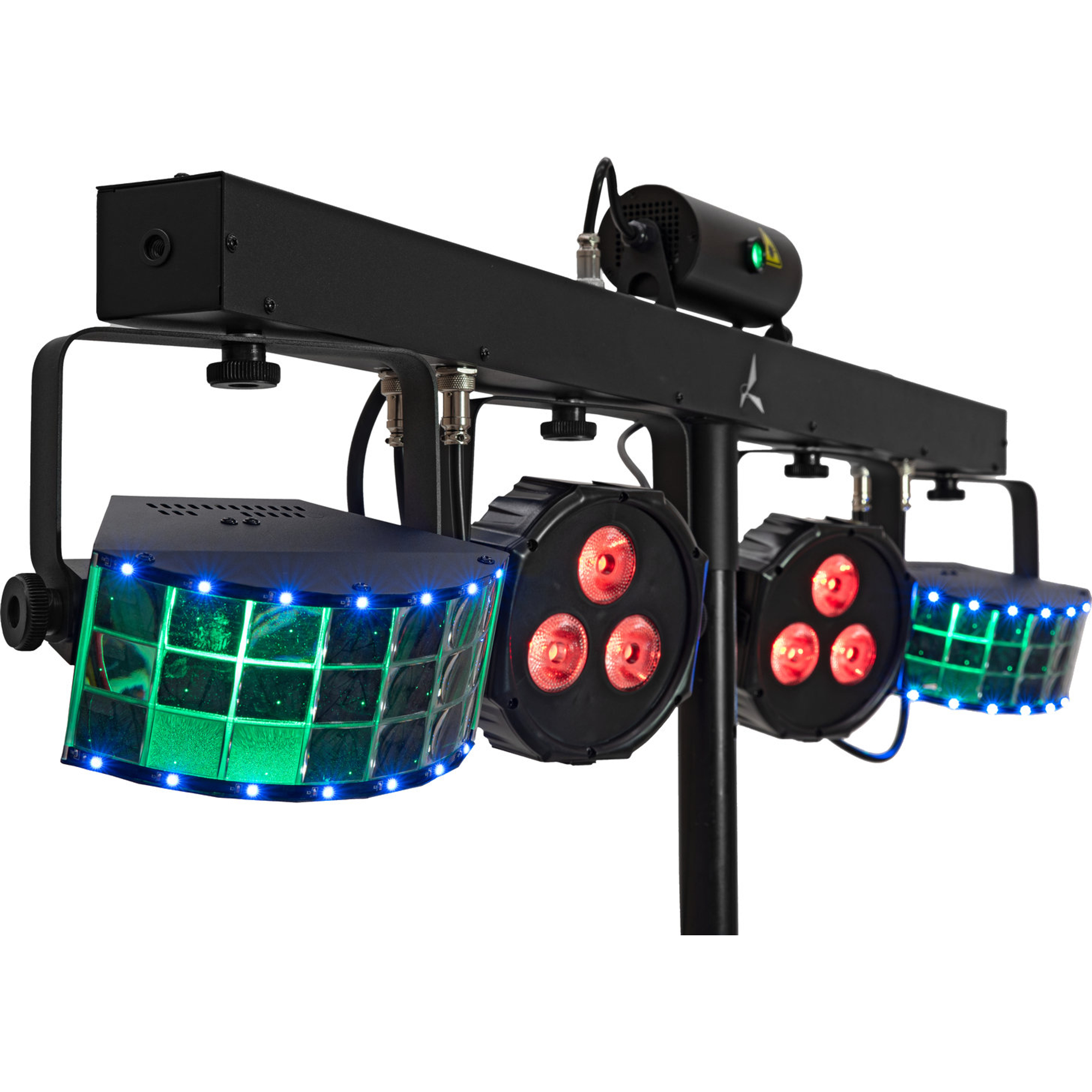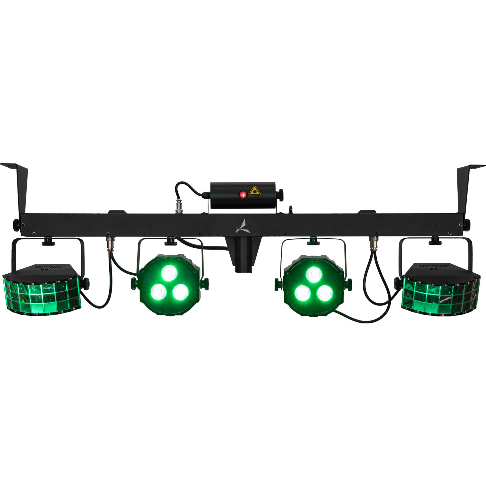 - Barre d'effets DMX 4-en-1 avec laser, 2 Derbys LED rotatifs, 2 spots LED et strobes blancs