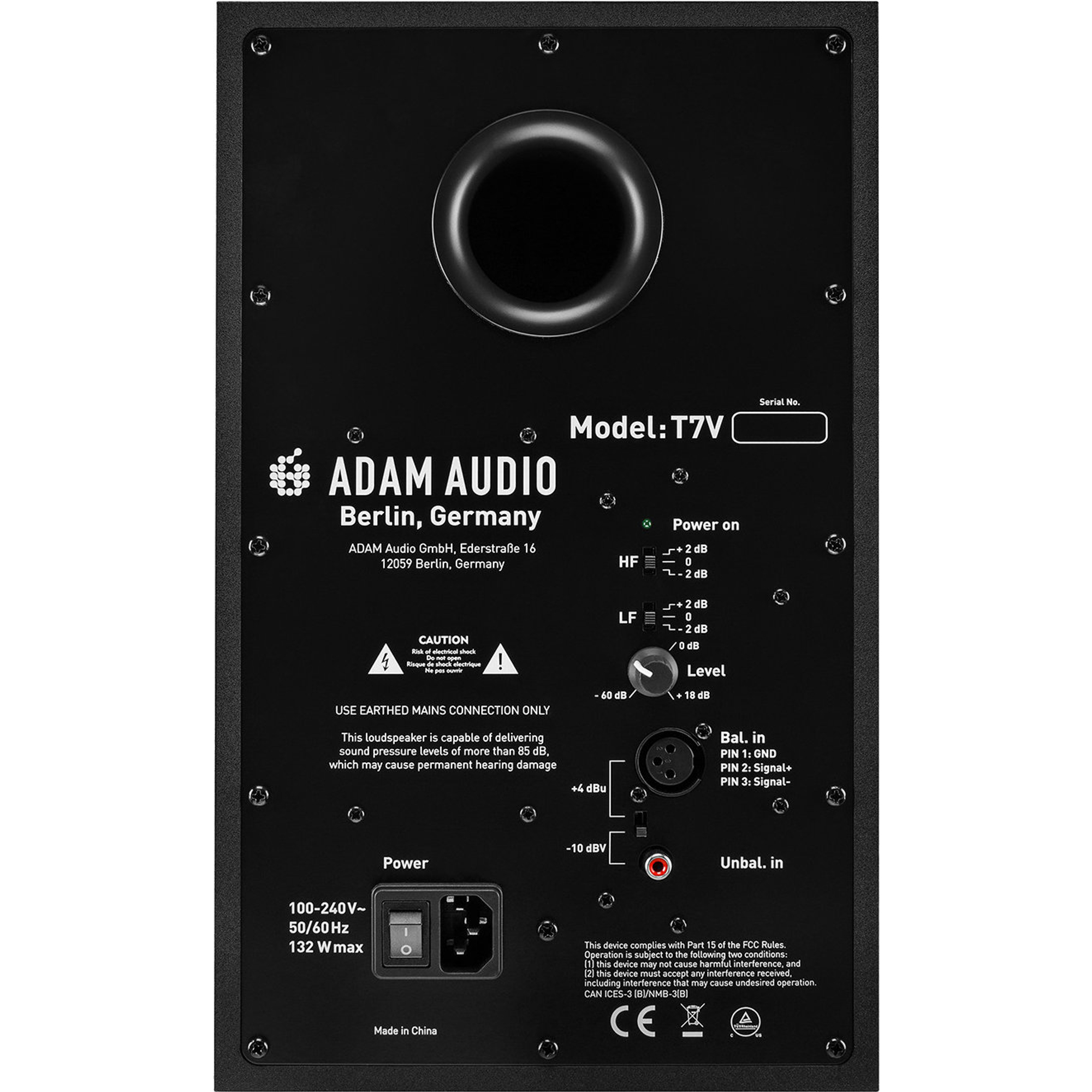 La face arrière métallique du T7V abrite l'évent bass-reflex ainsi que de nombreux réglages et entrées analogiques. Le tweeter U-ART est alimenté par un amplificateur de 20 W, tandis qu'un amplificateur de 50 W pilote le woofer. Ce concentré de puissance dans un boîtier fin délivre un niveau de pression acoustique maximal impressionnant de 110 dB SPL par paire.