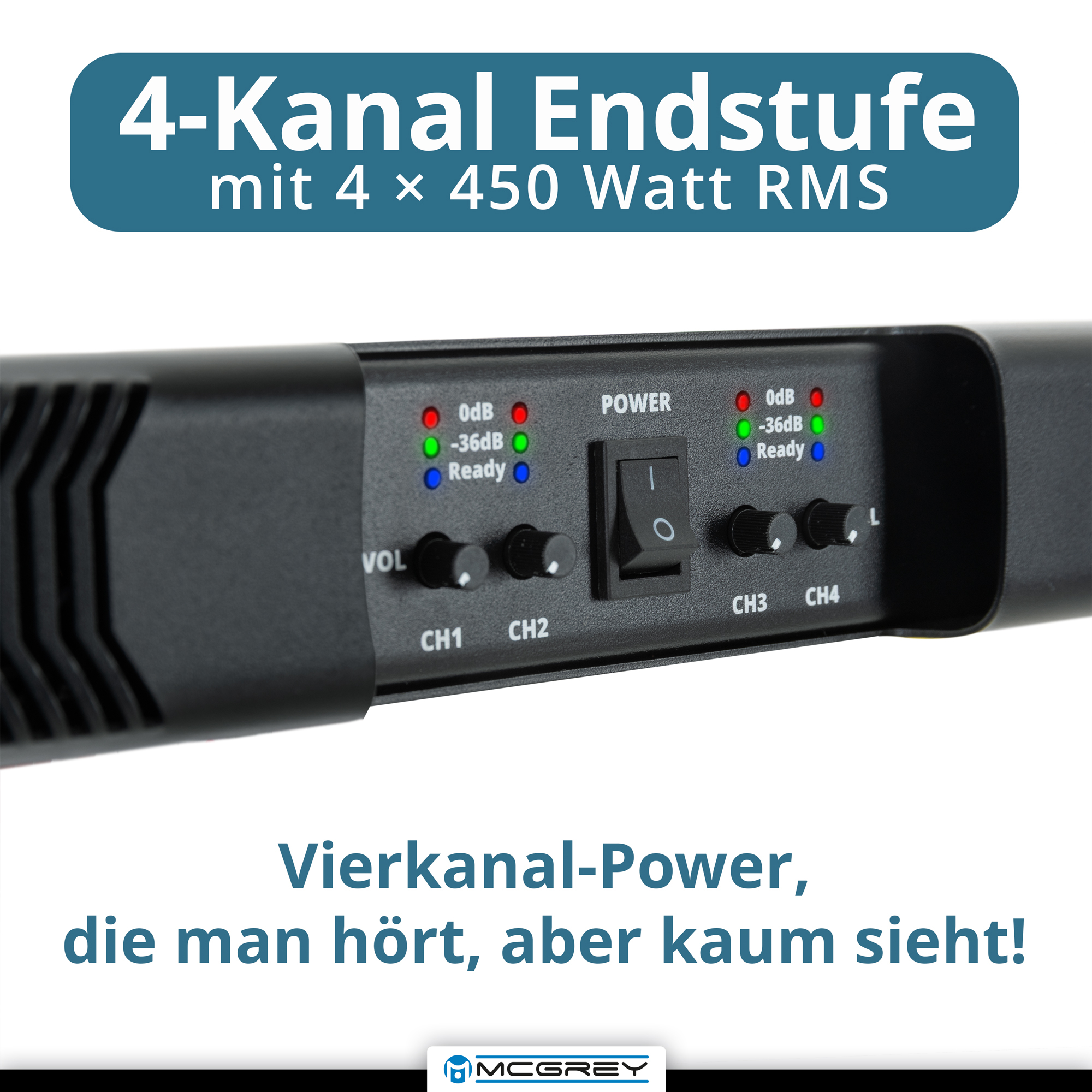 - Puissance : 4x 450 Watt (@ 8 Ohm / 4 Ohm / 2 Ohm, la pleine puissance est déjà disponible à 8 Ohm)