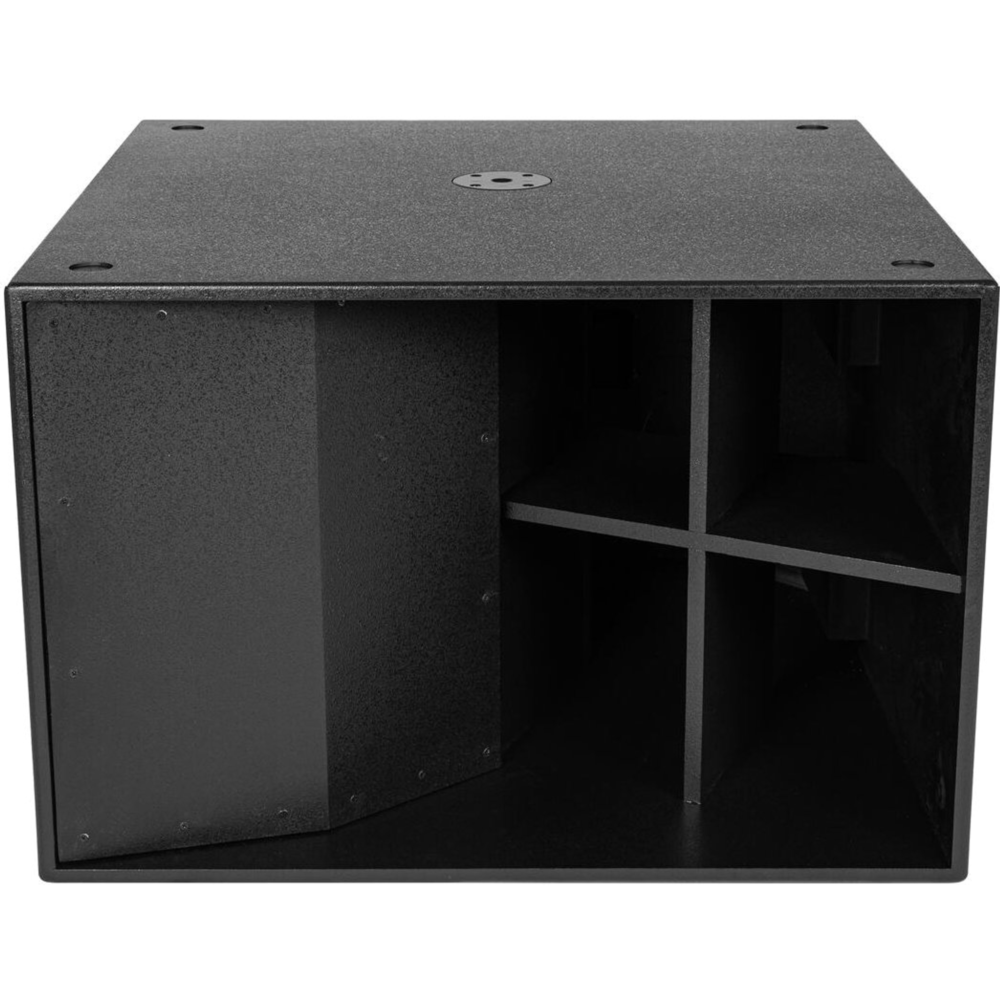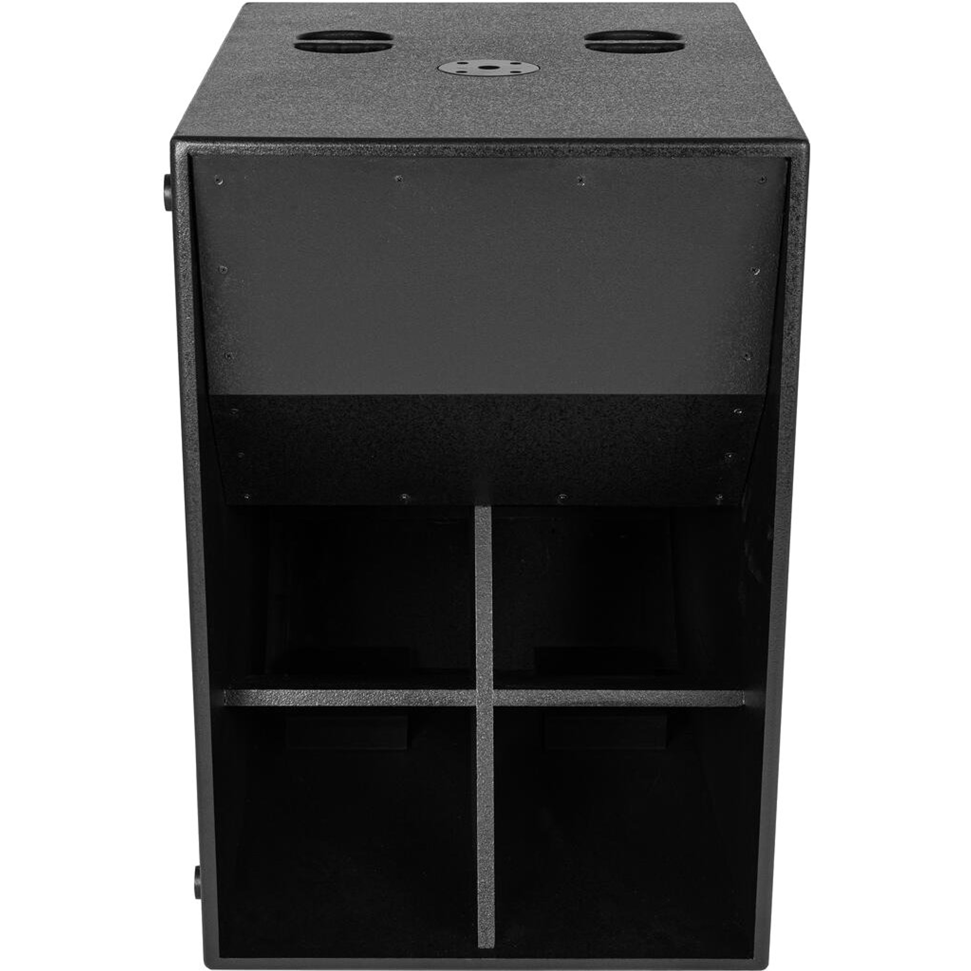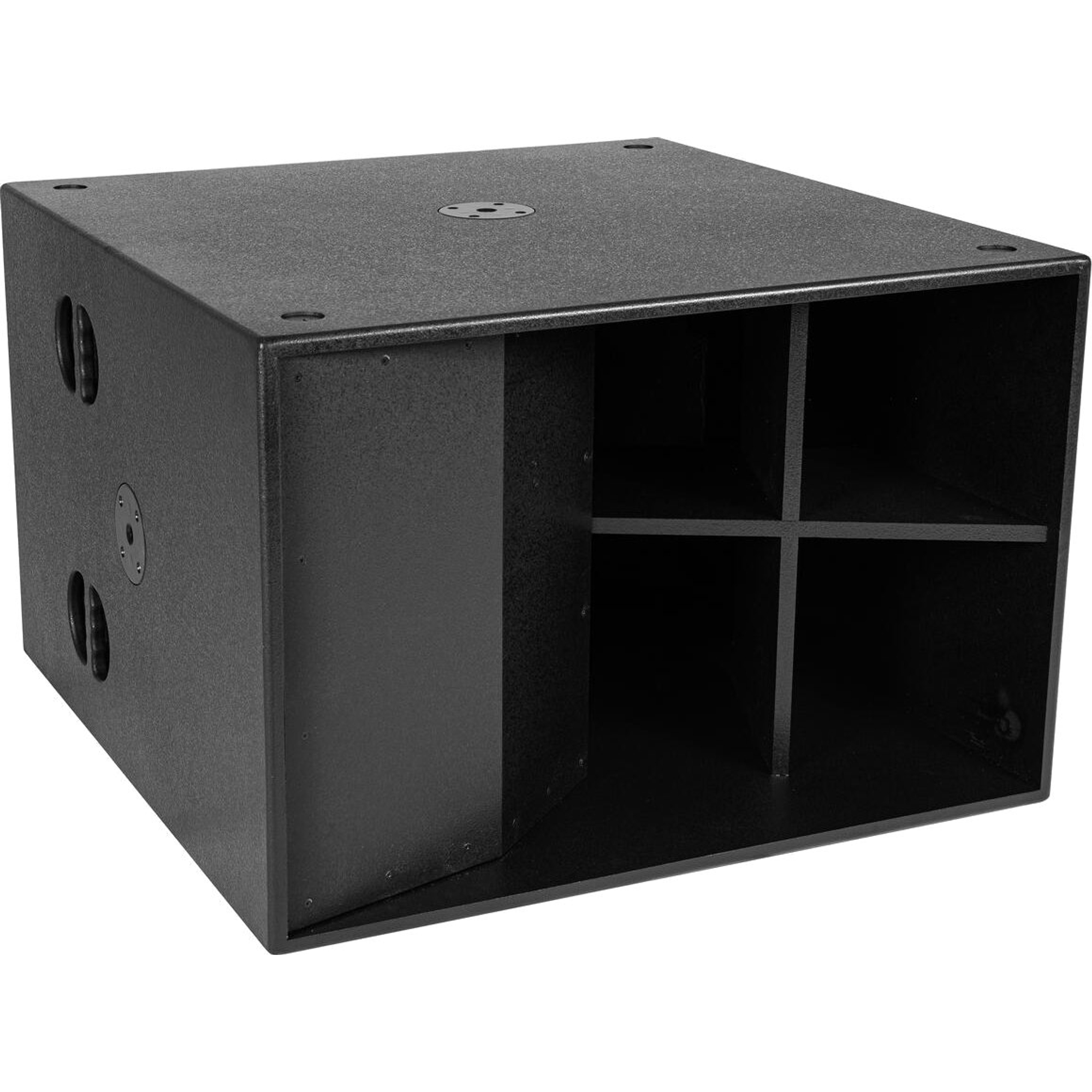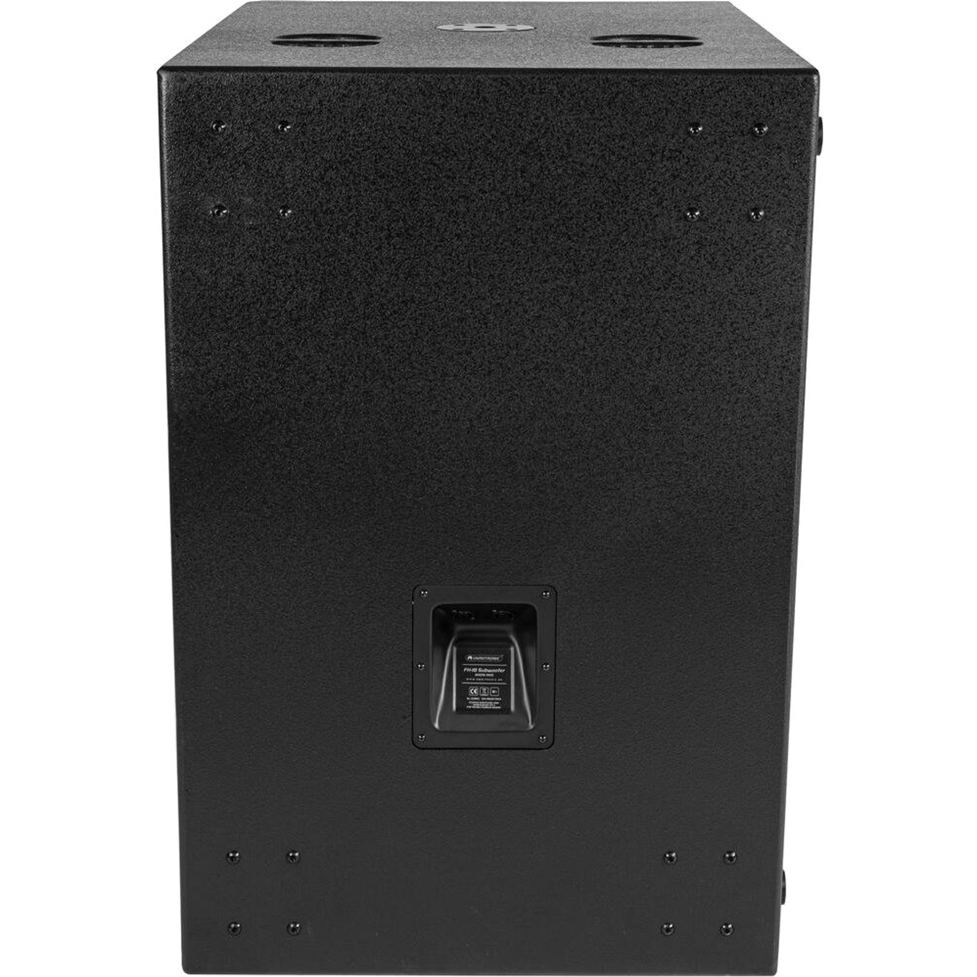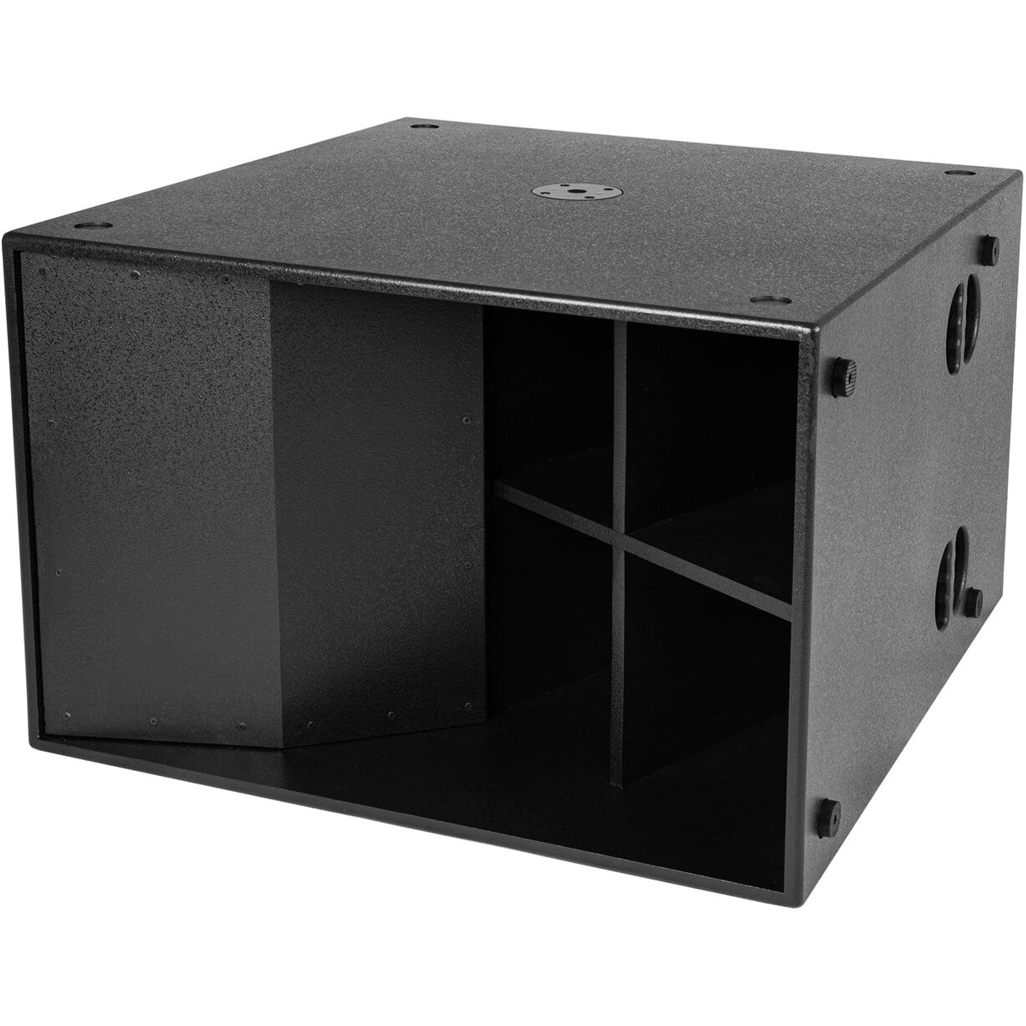 Le boîtier est fabriqué en panneaux MDF de 18 mm avec une peinture noire structurée — conçu pour résister aux contraintes de la location et des tournées. Quatre solides poignées encastrées facilitent la manutention, et il est possible d'ajouter quatre roulettes pour transporter facilement le subwoofer.