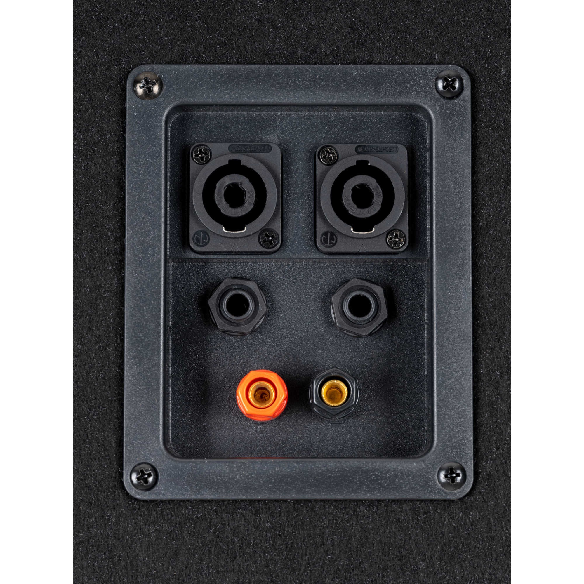 Ein 15" Woofer mit zwei Bassreflex-Rohren sorgt für ordentlich Wumms in der Bude. Im Hochtonbereich liefern drei Piezos messerscharfe, knackige Sounds (einer der 4 sichtbaren Hochtöner dient lediglich als Designelement). Die Anschlüsse sind als Klemmen, 6,3 mm Klinke und sogar Speakon-kompatibel ausgeführt, um größtmögliche Flexibilität zu gewährleisten. Somit können die Boxen sowohl an eine PA-Endstufe als auch an einen Hifi-Verstärker angeschlossen werden.