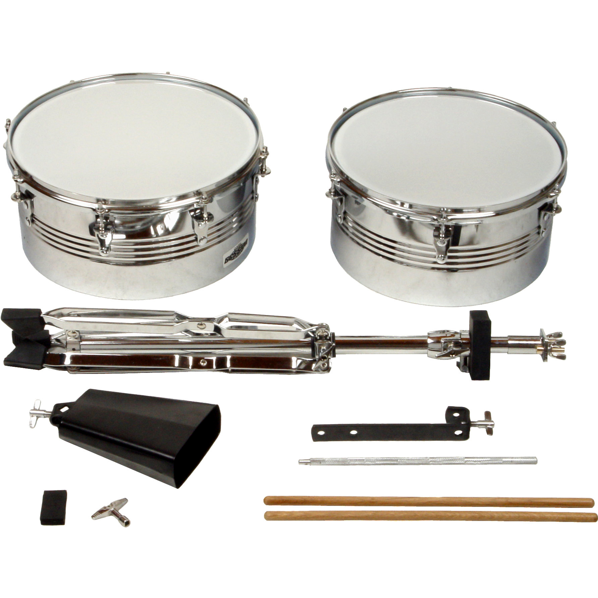Im Set sind außerdem ein Paar Sticks, 2 Cowbell Dämpfer und ein Stimmschlüssel enthalten. Somit kann sofort nach dem Aufbau mit dem Timbale Spiel begonnen werden.