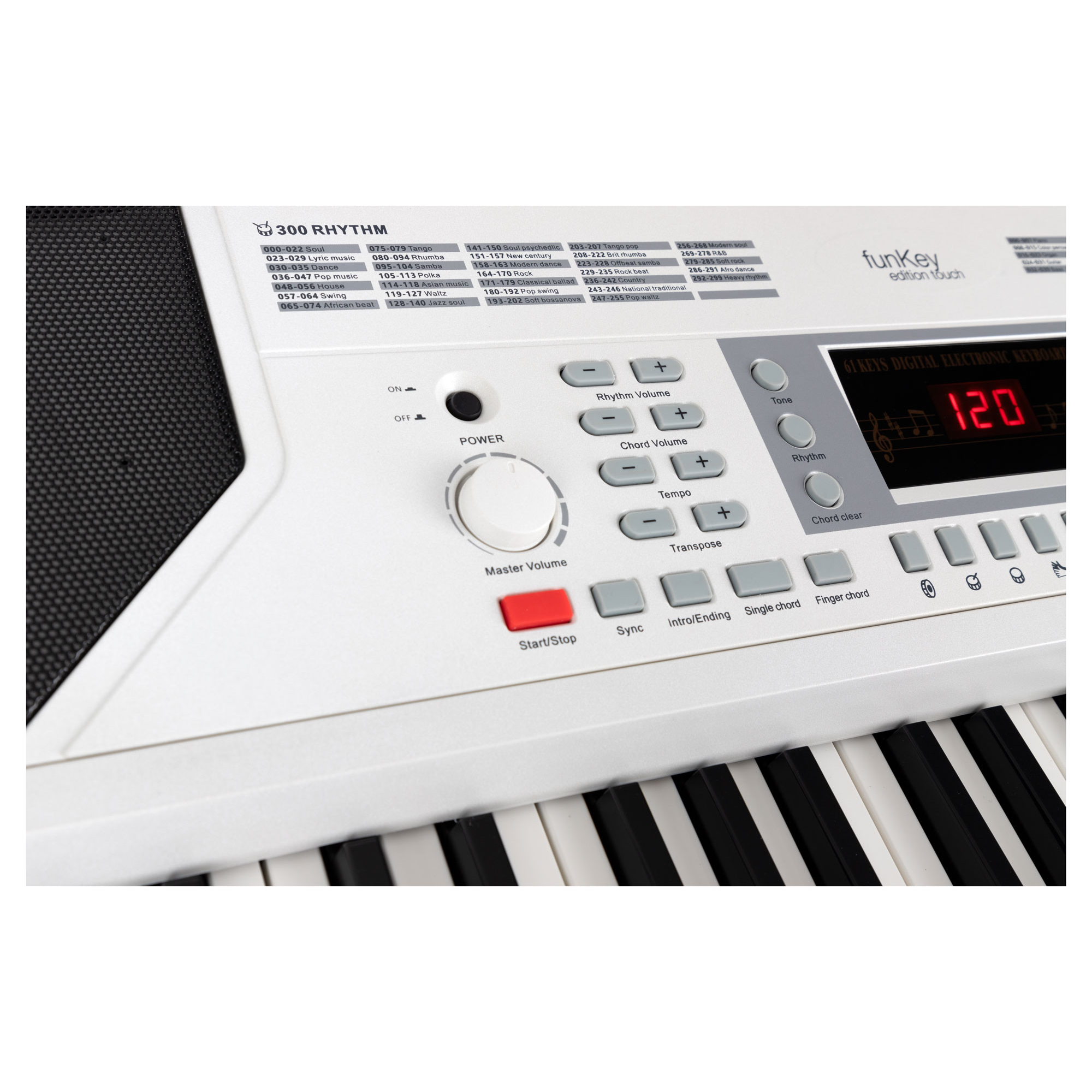 Die FunKey Edition-Serie wendet sich mit ihrem klassischen, zeitlosen, schnörkellosen Black-and-White-Design an Keyboardeinsteiger, die genau wissen, was sie wollen. Für den ambitionierten Einsteiger bietet die "Touch"-Version Tasten in Standardgröße mit Anschlagdynamik. Das 61 Tasten-Keyboard setzt auf klare Linien und ein betont zurückhaltendes Erscheinungsbild, das auf poppig-bunte Elemente und verspielte Details bewusst verzichtet. Gleichzeitig bietet das "Edition" technisch alles, was man als preisbewusster Musiker von einem Einsteigerkeyboard erwarten darf.
