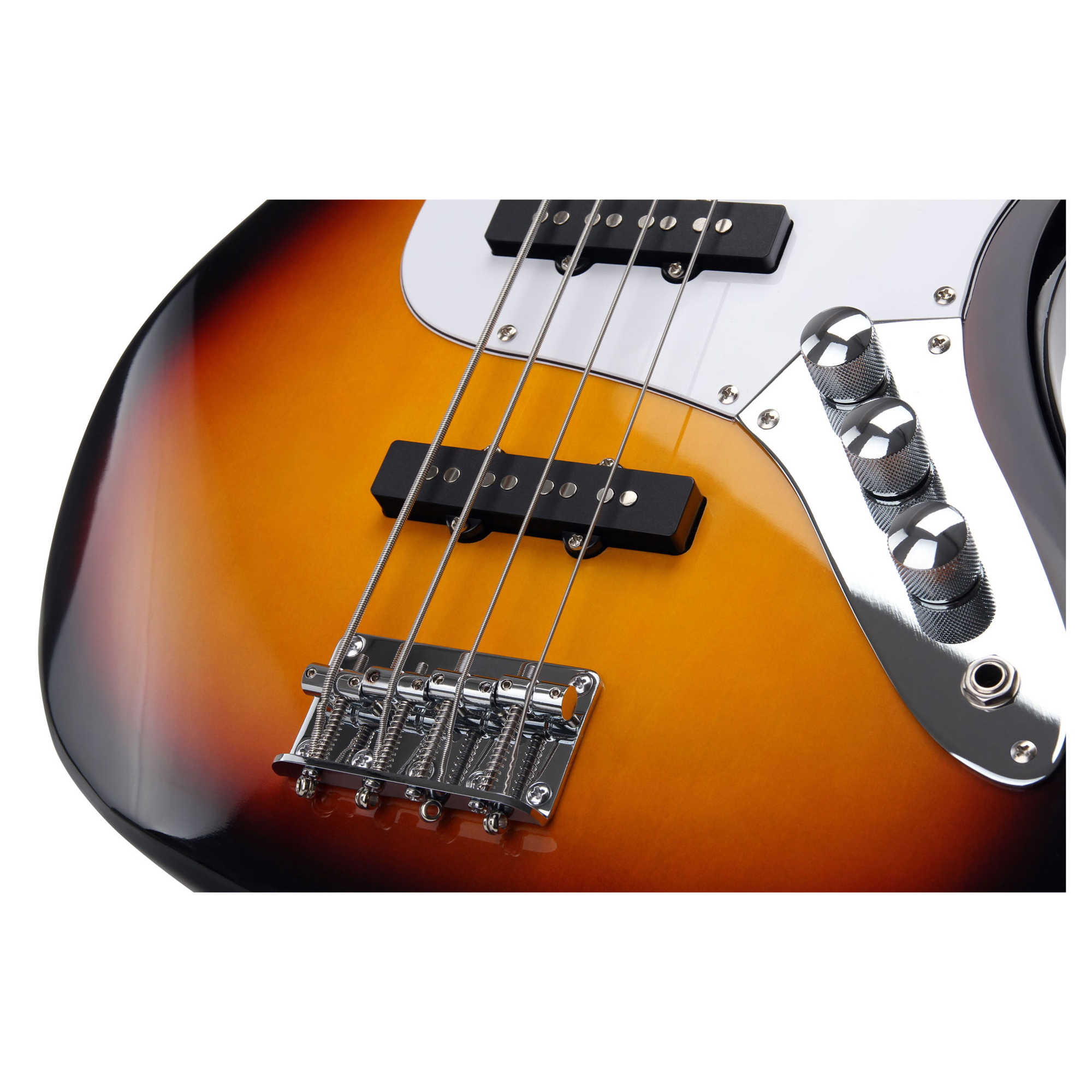 Der Rocktile E-Bass im klassischen Jazz Bass-Outfit und Sunburst Finish sieht nicht nur wunderschön aus, sondern hat auch in Sachen Soundvielfalt einiges zu bieten. Mit den zwei getrennten Volumereglern lassen sich die beiden Single-Coil Tonabnehmer separat zumischen und somit unterschiedlichste Soundvarianten abdecken. Mit dem Tone-Regler kannst Du weiter feinste Nuancen in Deinen Sound bringen.