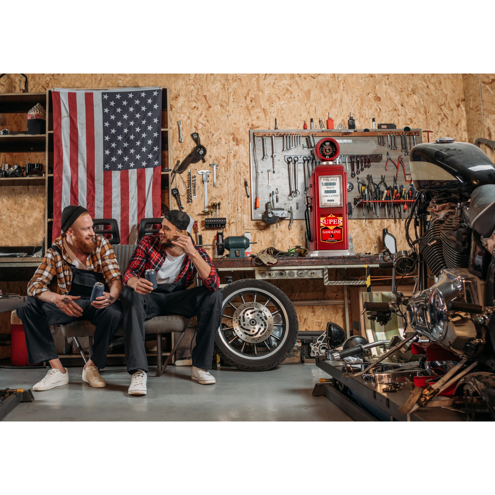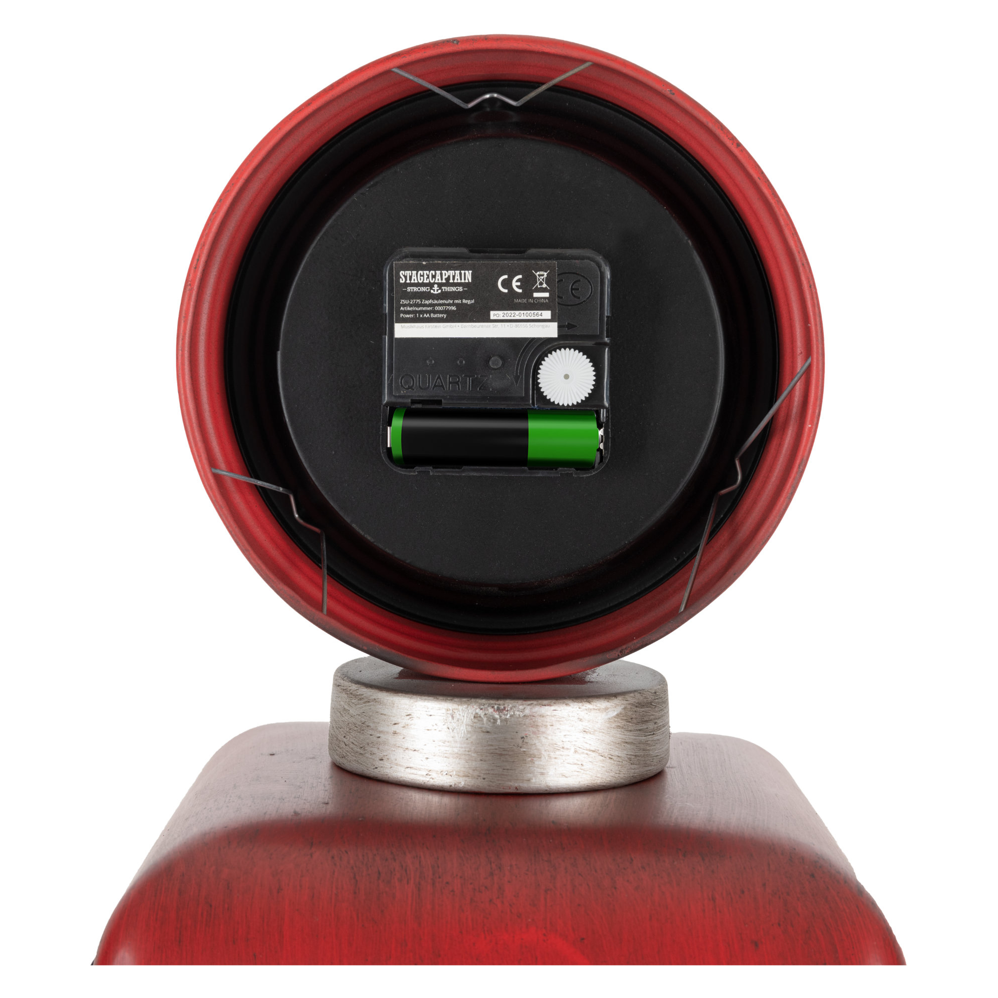 Das Gehäuse, die Details und auch das Regal der Uhr bestehen aus Metall und wurden im Zapfsäulendesign lackiert. Die Maßen belaufen sich auf 26 x 76 x 26 cm (B x H x T), das Gewicht auf ca. 3,8 kg. Durch das leise, batteriebetriebene Quarzlaufwerk ist sie auch in Ruheräumen und Chill-Areas einsatzbereit.