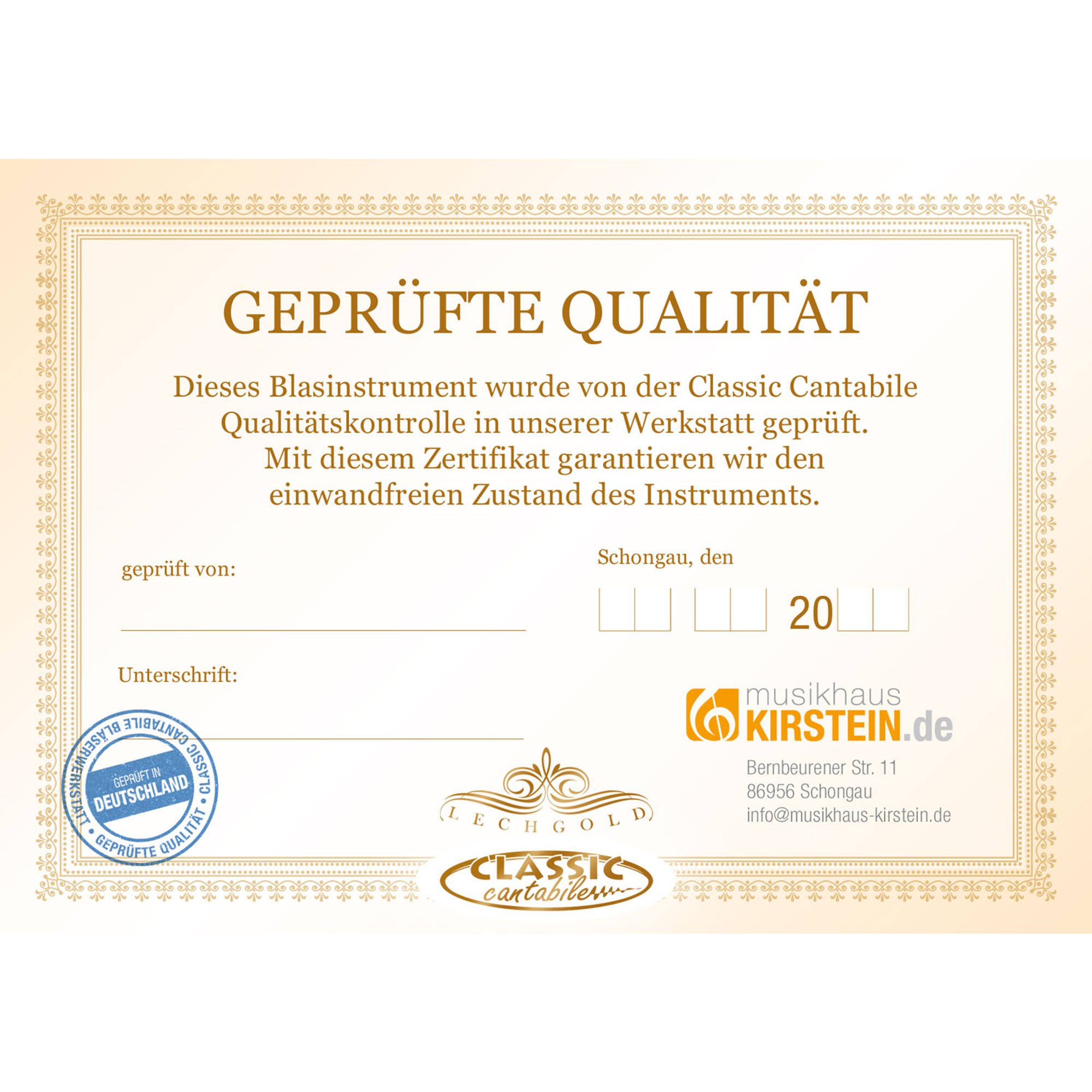 Damit Du an Deinem Instrument lange Freude hast, werden alle Blasinstrumente von der Kirstein-Qualitätskontrolle geprüft. Dies geschieht in unserer meistergeführten Bläserwerkstatt durch qualifizierte Instrumentenbauer. Den einwandfreien Zustand garantieren wir auf einem Zertifikat, das dem Instrument beigelegt wird.