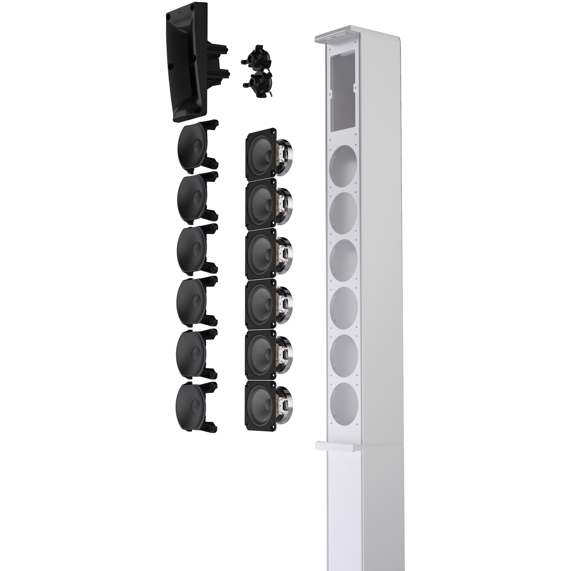 Das kardioidale Verhalten der Säule wird durch einen cleveren Einsatz von dämpfendem Akustikschaumstoff hinter den Hoch- und Mitteltönern innerhalb der Säule sowie durch präzise Ausschnitte im Aluminiumgehäuse der Säulenrückseite ermöglicht.