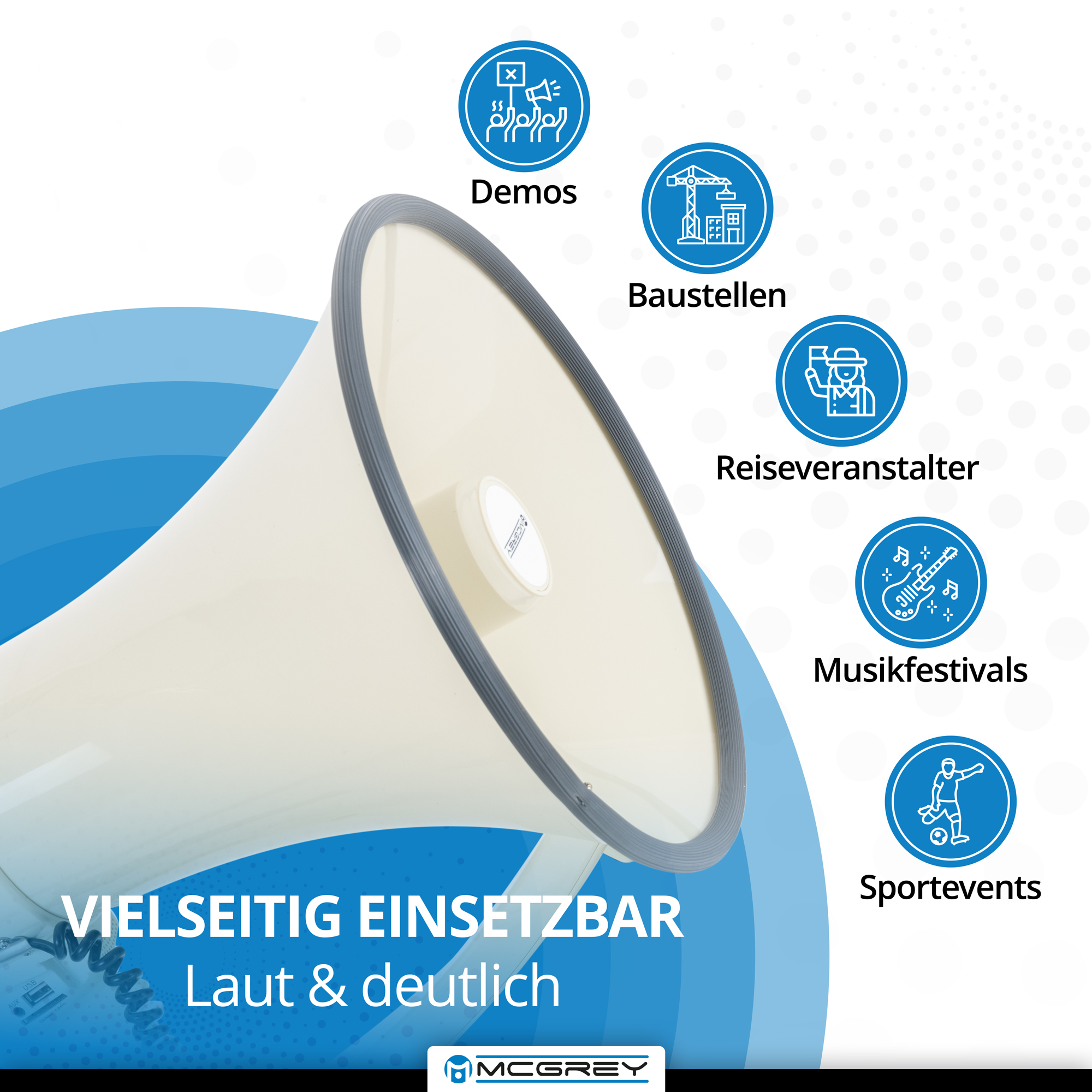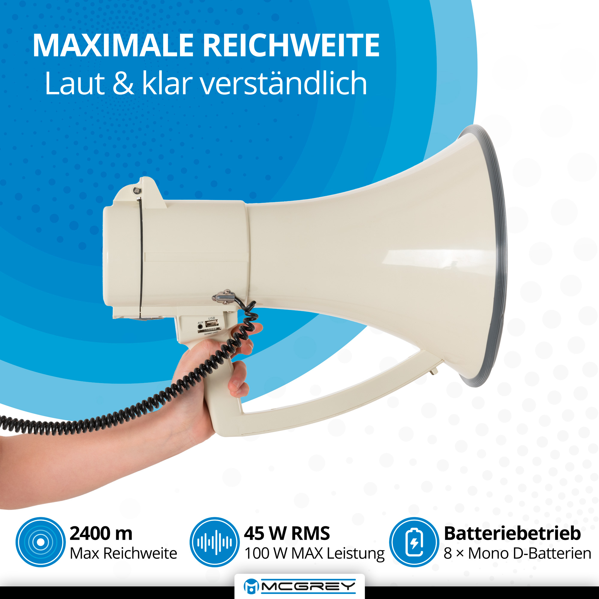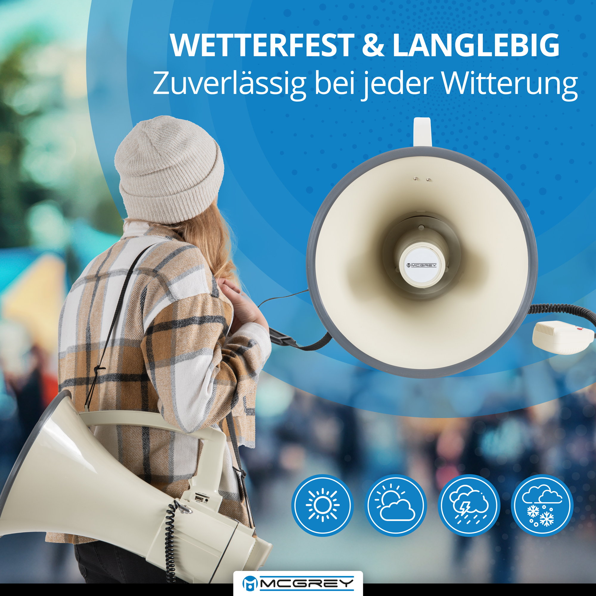 Das McGrey MP-2000HRS MkII Megaphon ist das ideale Hilfsmittel auf Baustellen, beim Bootssport, Fußballtraining oder für Reiseveranstalter, wenn eine Durchsage eine größere Menschenmenge erreichen soll. Damit das batteriebetriebene Sprachrohr dabei uneingeschränkt jeder Witterung standhält und genutzt werden kann, ist das Batteriefach wetterfest geschützt. Platzregen, Schlammschlacht, Sonnenschein - Deinem nächsten Stadionbesuch oder der nächsten Demo steht nichts mehr im Wege!