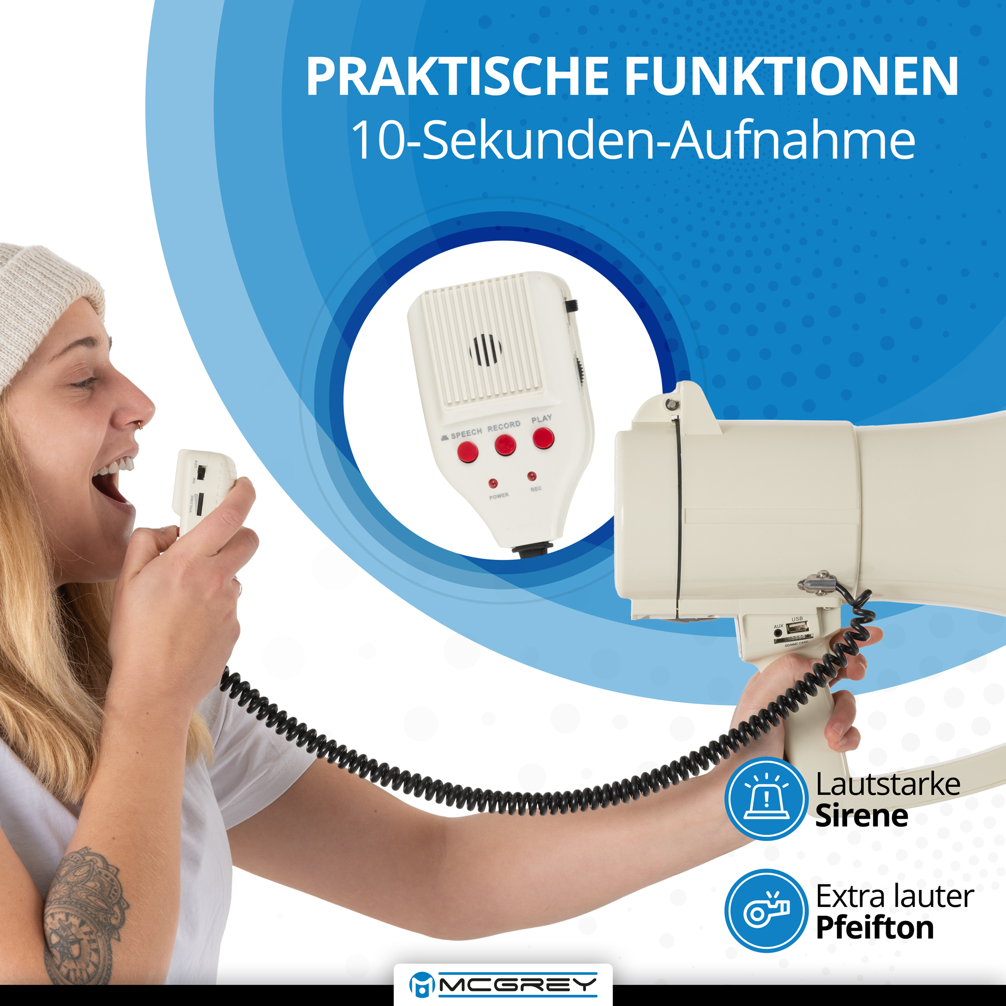 Mit der Aufnahmefunktion des McGrey Stimmverstärkers ist es möglich, eine über 10 Sekunden dauernde Textparole, ein Geräusch oder das nächste Kommando aufzunehmen, um diese anschließend wiederzugeben. Diese stimmschonende Funktion kommt vor allem Marktschreiern oder Straßenkünstlern zugute, die Teile ihrer Show vorab aufnehmen und bei Bedarf nur noch wiedergeben müssen.