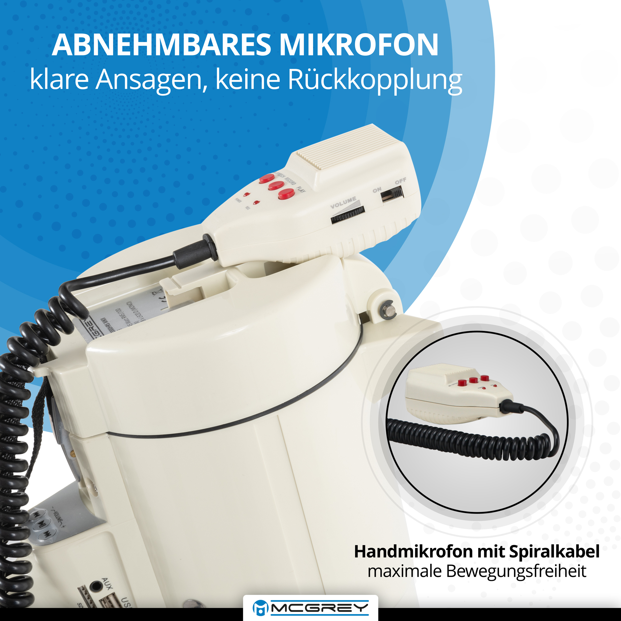 Ungewünschte Rückkopplungen beim Sprechen in das Megaphon werden durch das abnehmbare, mit einem Spiralkabel verbundene, Handmikrofon von vornherein vermieden und somit beste Sprachverständlichkeit gewährleistet. Zudem finden sich weitere Bedienelemente zur kinderleichten Bedienung am Handgerät. Klare und deutliche Ansagen für gute Verständlichkeit!