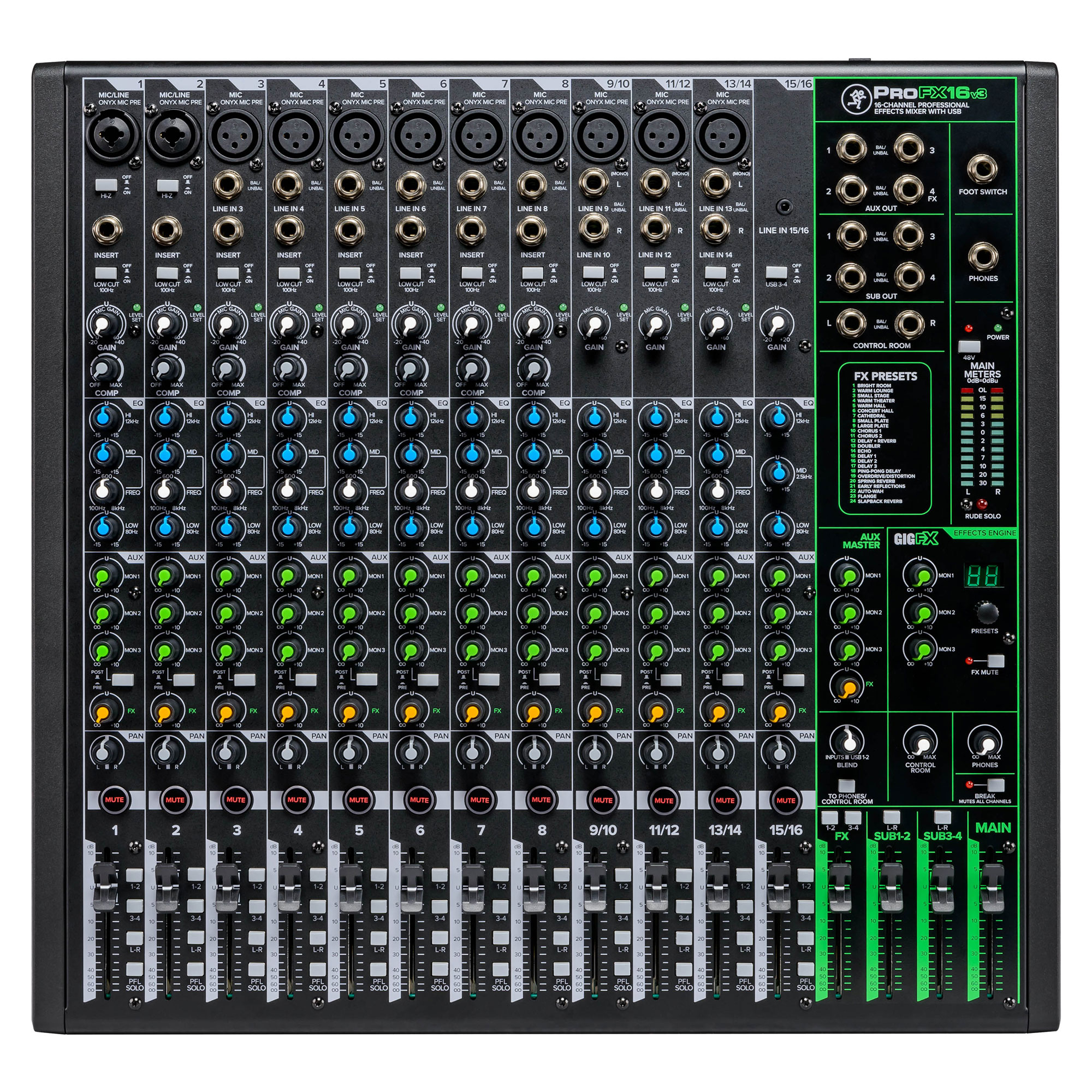 Das professionelle Mackie ProFX16v3 16-Kanal Mischpult mit Effekten und USB ist die ultimative kostengünstige Lösung für Live-Sound, Homerecording und Content Erstellung. Mit den renommierten Onyx-Mikrofonvorverstärkern mit 60 dB Headroom wird alles, von dynamischen Mikrofonen bis hin zu Gitarren, besser klingen als je zuvor, und mit den einfachen Einknopf-Kompressoren behält man die Dynamik stets im Griff.