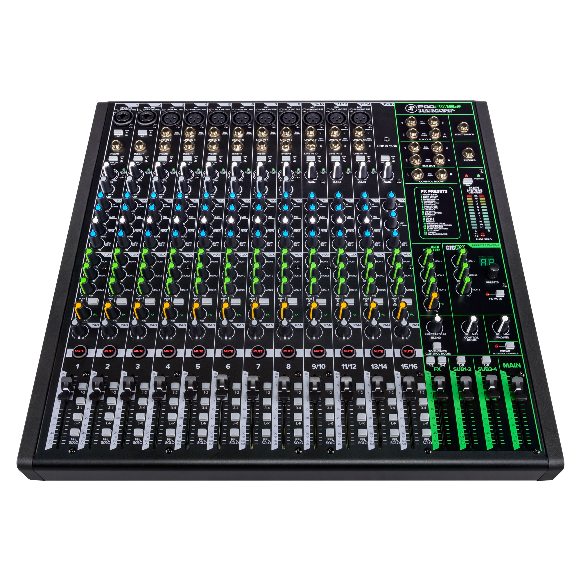 Mit den ProFXv3-Mixern bringt Mackie die meistverkaufte Serie für Live-Mixing, -Aufnahme und -Inhaltserstellung auf die nächste Stufe. Ausgestattet mit den legendären Onyx-Mikrofonvorverstärkern, 2x4 192-kHz-Aufnahme, GigFX-Effekt-Engine und in neuem, modernen Design.