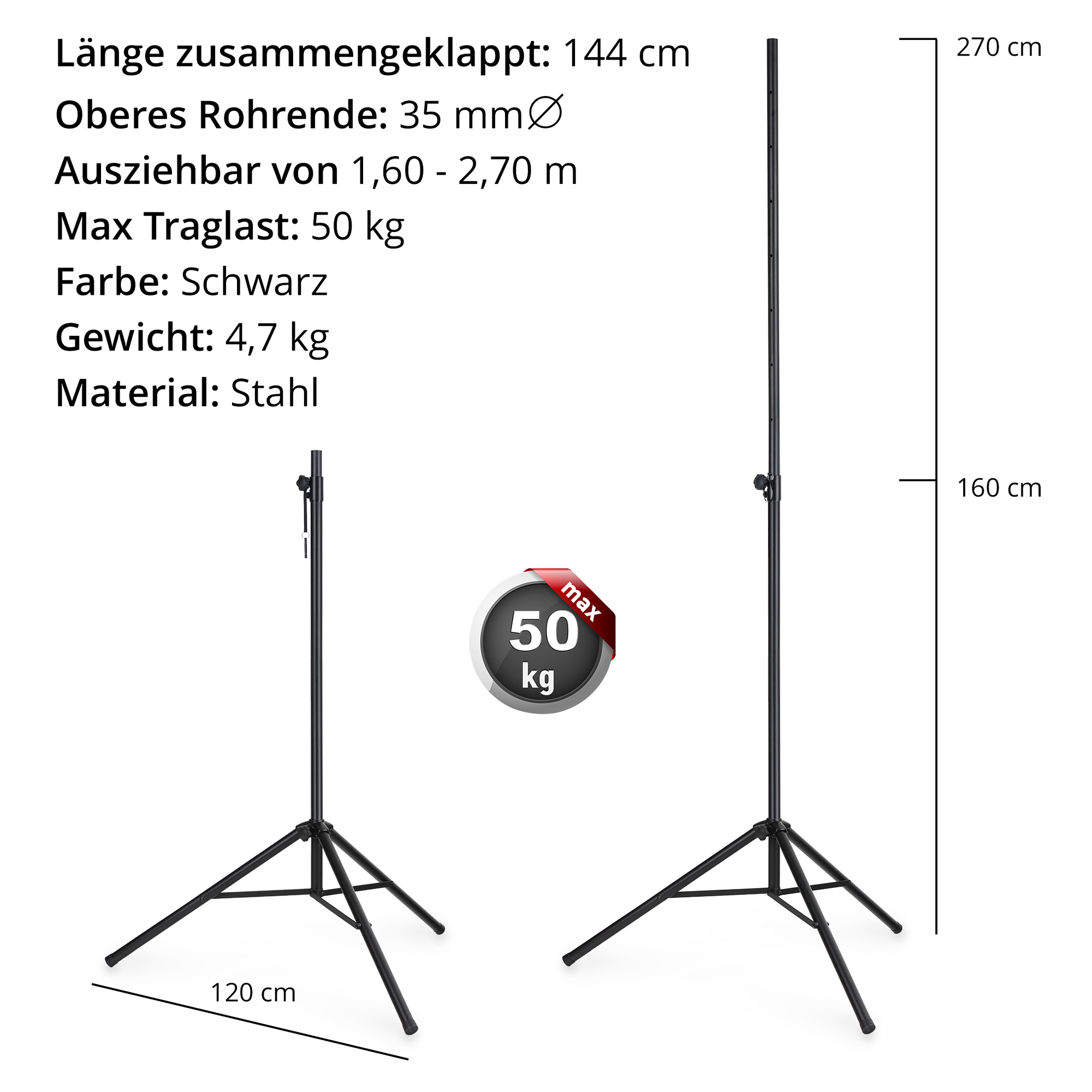 Das fast vollständig aus Metall bestehende Stativ ist mit seiner stabilen Rohrkonstruktion extrem robust und belastbar bis zu einer Traglast von 50 kg. Das einfach ausziehbare Rohr wird durch ein Kunststoff-Fitting vor Kratzern geschützt und mit einem Sicherheitsstift gesichert. und ist bis zu einer Höhe von 280 cm ausziehbar.