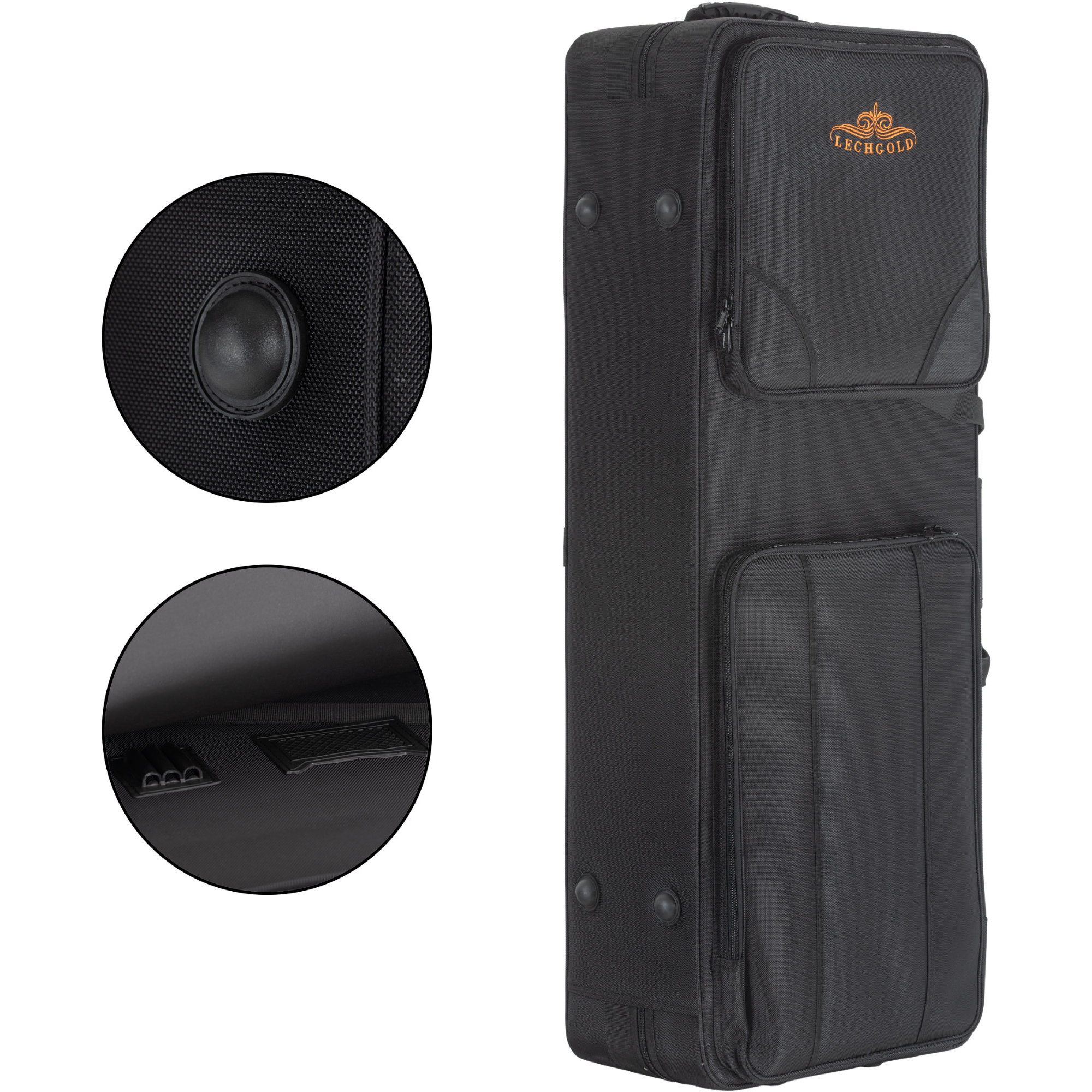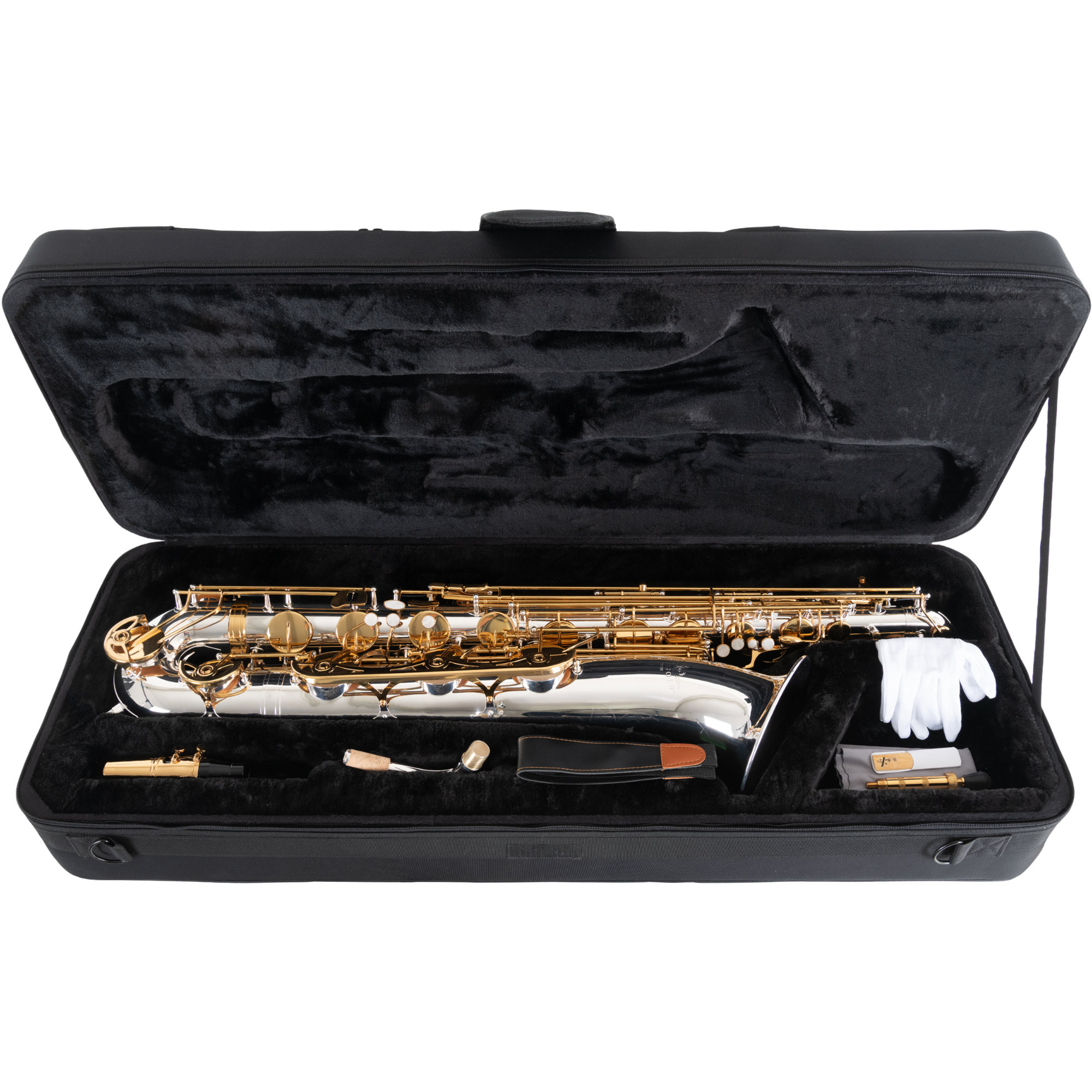 L'instrument est livré bien sûr dans un robuste étui léger. Celui-ci est équipé de pochettes intérieures pour le cou en S, l'embouchure et les accessoires ainsi que de deux grandes poches extérieures. Poignée de transport, poignée « métro » (pour le transport vertical), une sangle d'épaule optionnelle ainsi que les pratiques roulettes trolley garantissent un transport confortable de l'instrument vers la répétition ou le concert.